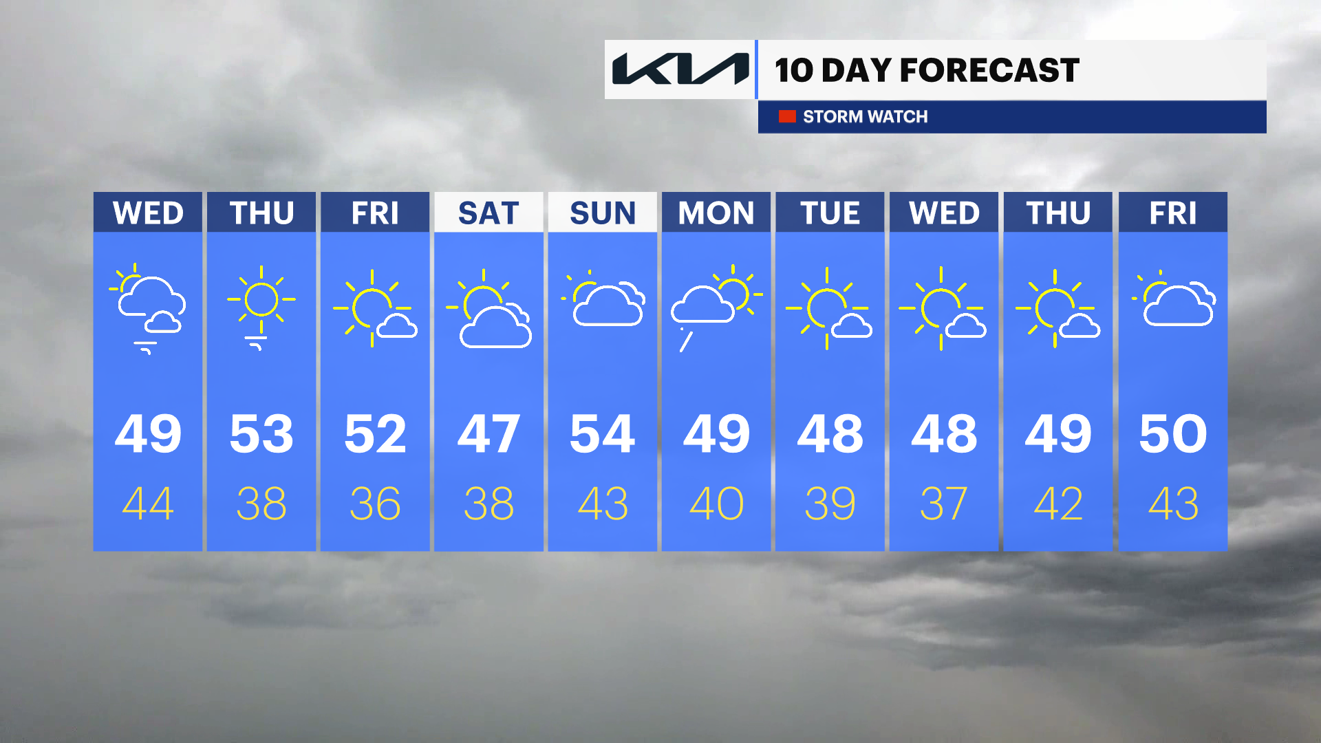 THURSDAY: Bright and breezy. Highs in the low 50s and lows in the higher 30s.