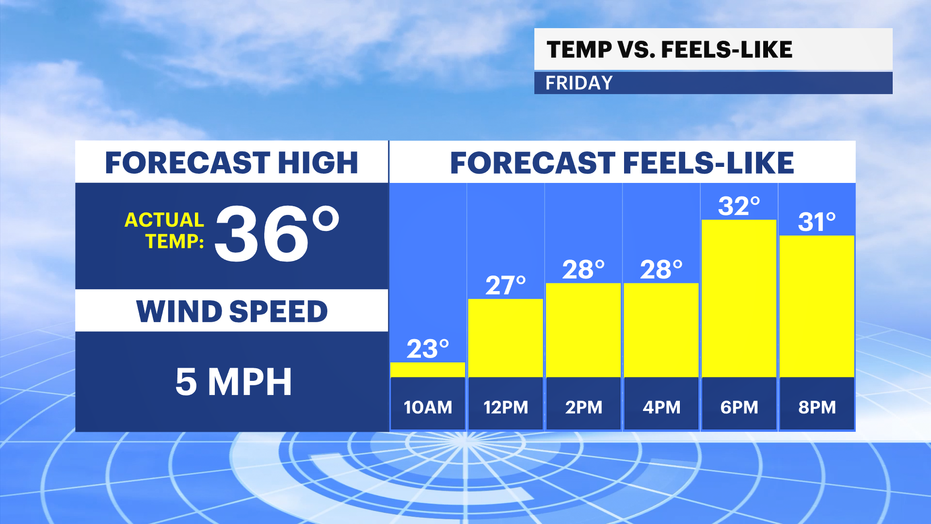 At least the wind will subside quickly overnight with more of a 5 to 15 mph breeze after midnight. With actual air temperatures dropping into the upper teens, even a lighter breeze into Friday morning can still make it feel like the upper single digits to low teens.