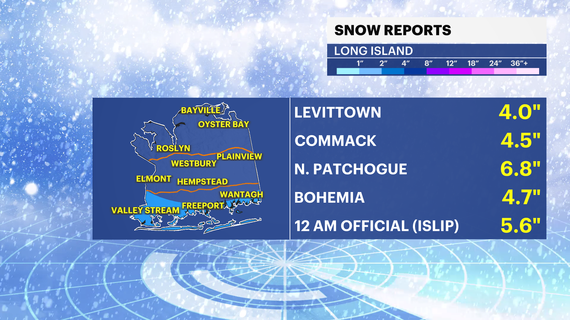 Snow reports are coming in at 4-6 inches overnight, but official storm totals will likely be higher, especially on the north shore and in Suffolk County. Officially, Islip reported 5.6 inches of snow as of midnight.