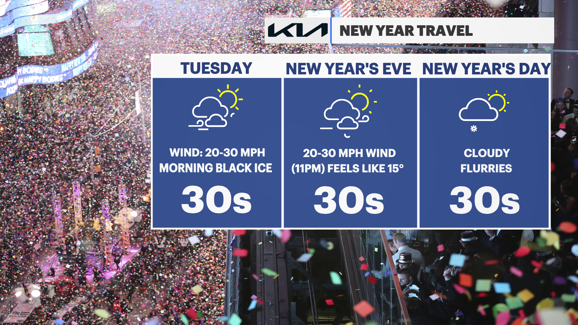 It's windy Tuesday and Wednesday but dry. Highs in the low to mid 30s but feels colder. A few snow showers are possible New Year's Day on Thursday.