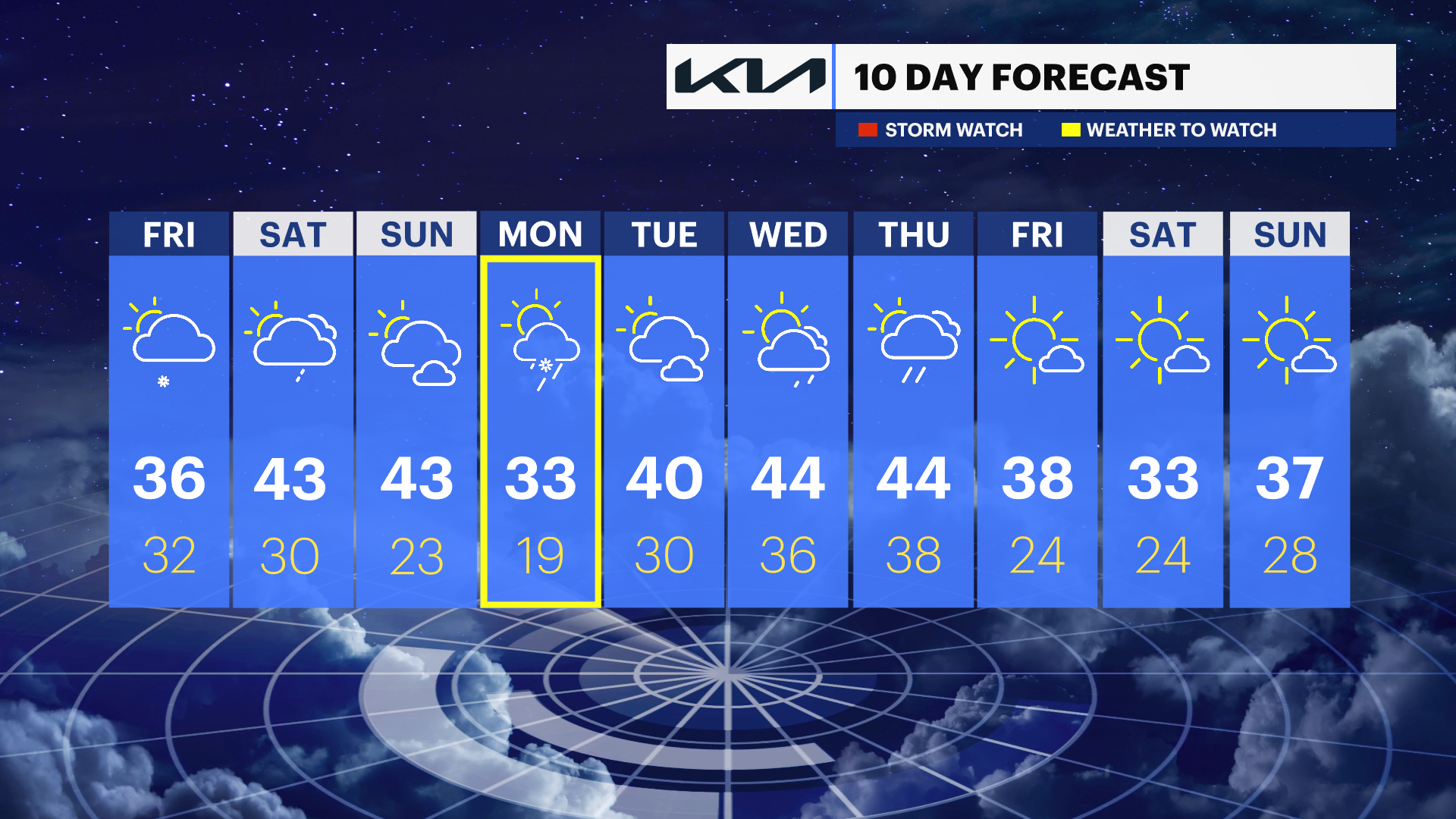 FRIDAY: Continue to dress in layers. Very cold in the morning. It will feel like the teens at best through 9 a.m. Clouds increase and it becomes mostly cloudy for the afternoon with a few spotty snow showers and flurries possible. At worst, a trace of snow is possible, mainly on colder surfaces. Highs around 36 degrees with even a lighter wind will feel like the 20s at times. Lows near 32 degrees. A few flurries or even raindrops cannot be ruled out overnight and into Saturday morning.