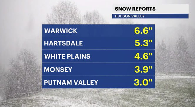 Around 1-6" of snow fell across the Hudson Valley with some of the higher numbers in Orange and Westchester Counties.