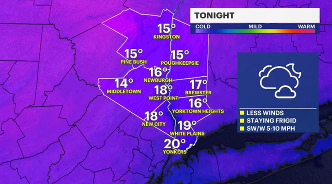 TONIGHT: Increasing clouds with a light breeze at times. Lows: upper 10s to mid-20s.