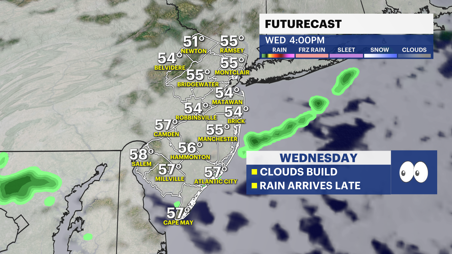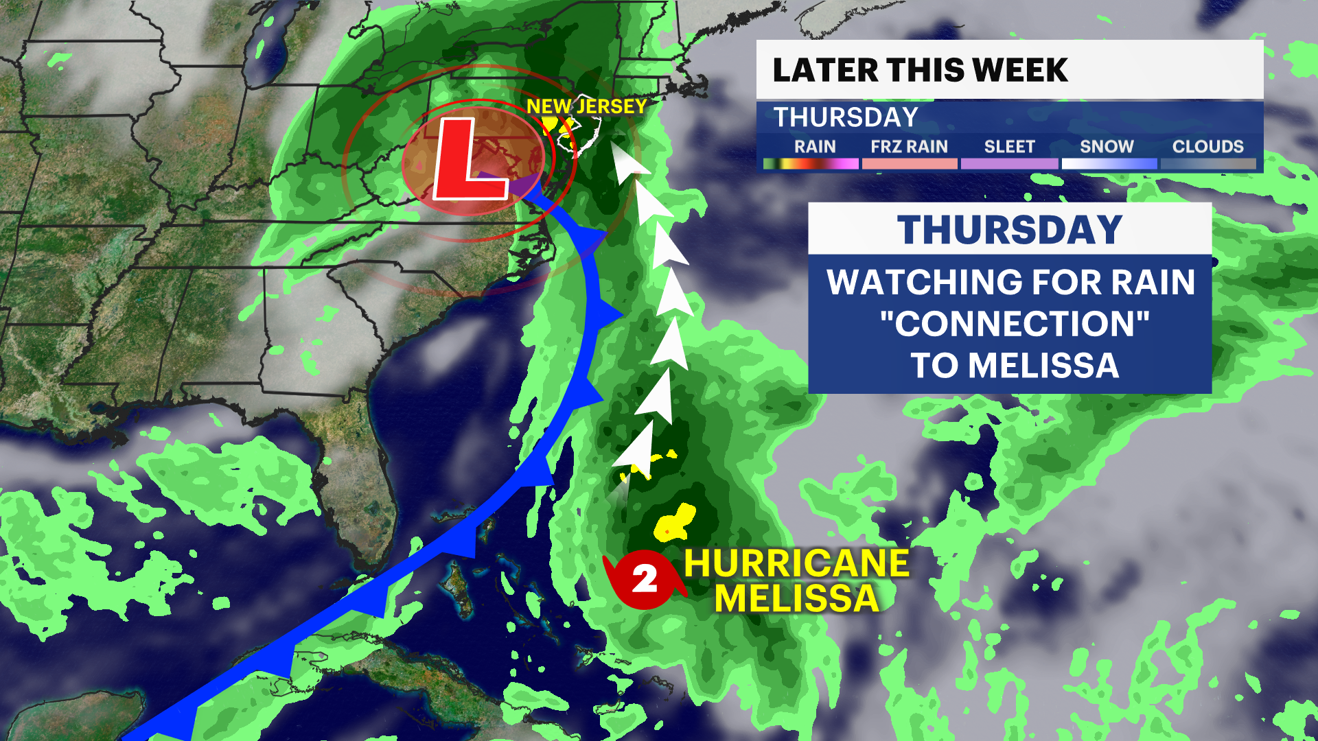 There is a possibility that moisture from Hurricane Melissa can be absorbed into the weather front as it passes through New Jersey, enhancing rainfall. This detail is to be determined.