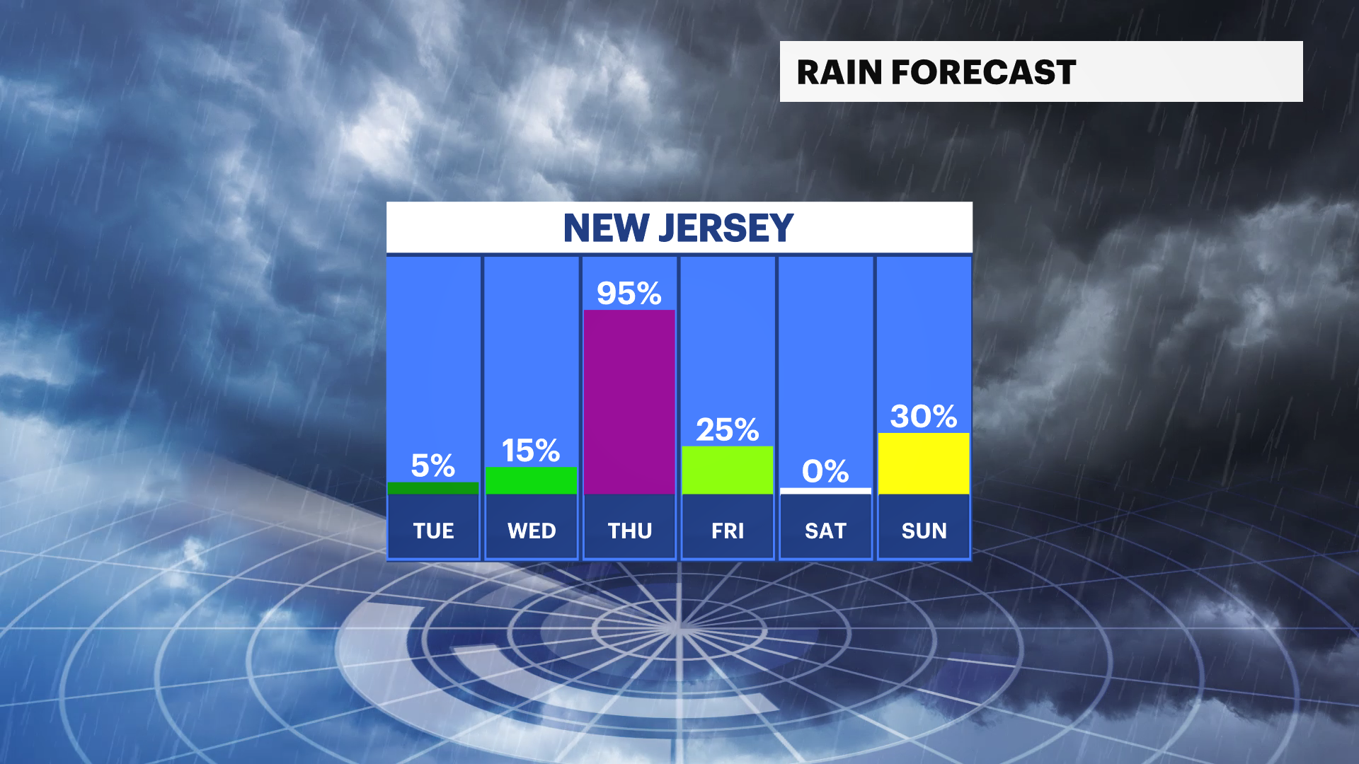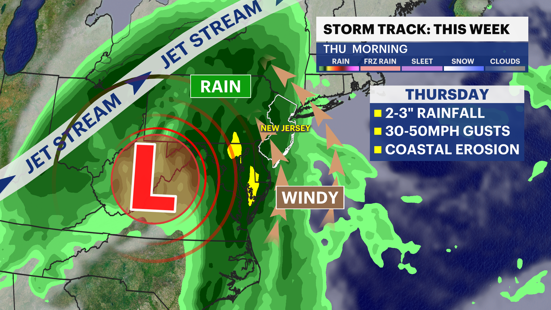 A strong storm will develop across the middle of the U.S. that moves into New Jersey for Thursday, delivering strong winds, inland rain up to 2 to 3 inches in spots. This weather pattern is unfolding and developing, and details will be refined each day this week.
