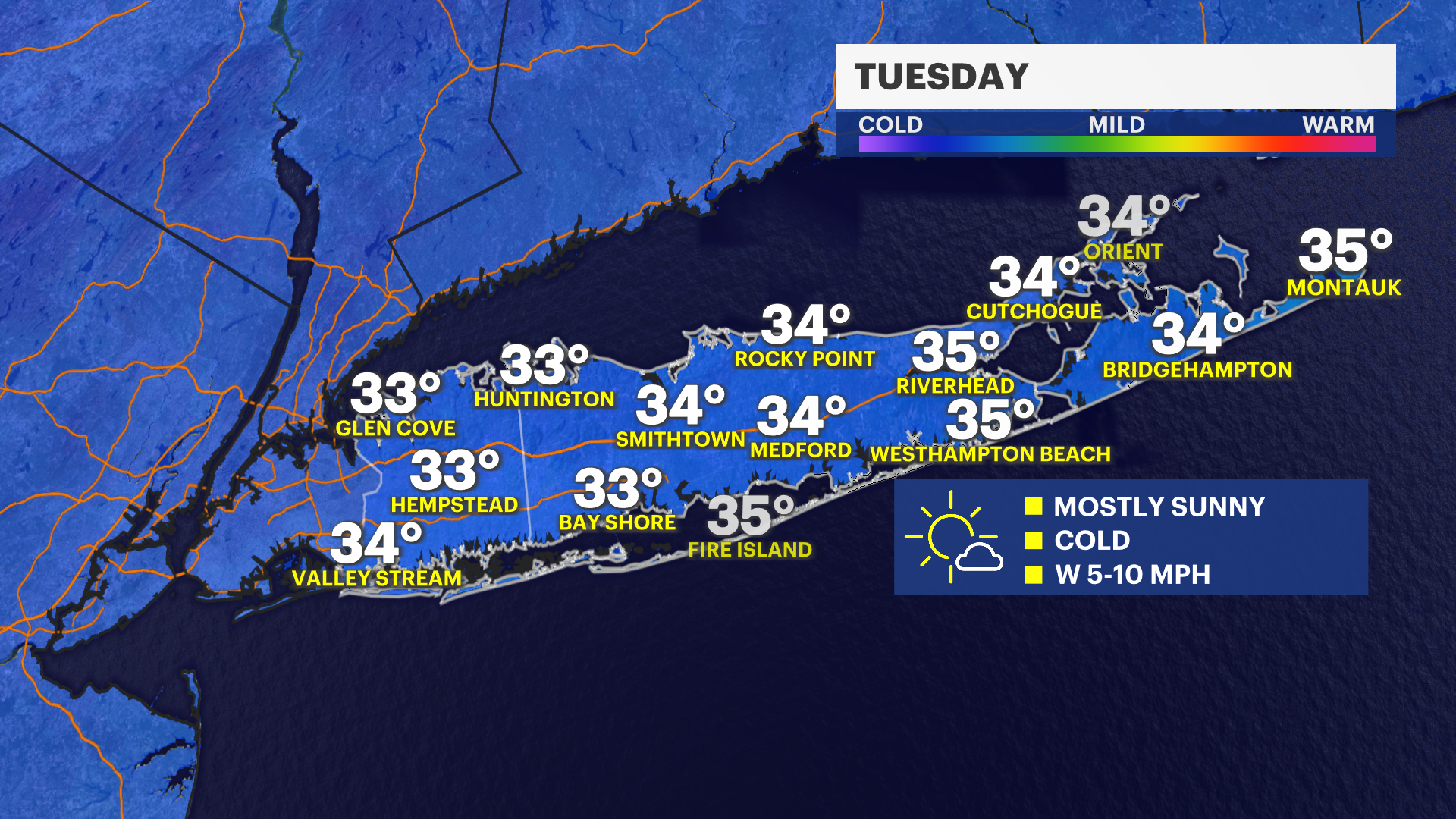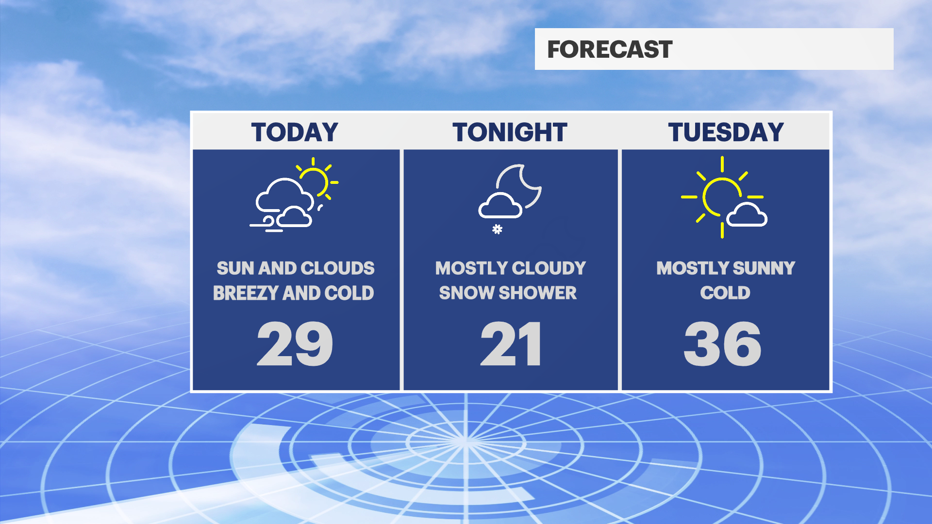 Tuesday: Mostly sunny with a high near 36. Wind chill values between 15 and 25. West wind 5 to 15 mph.