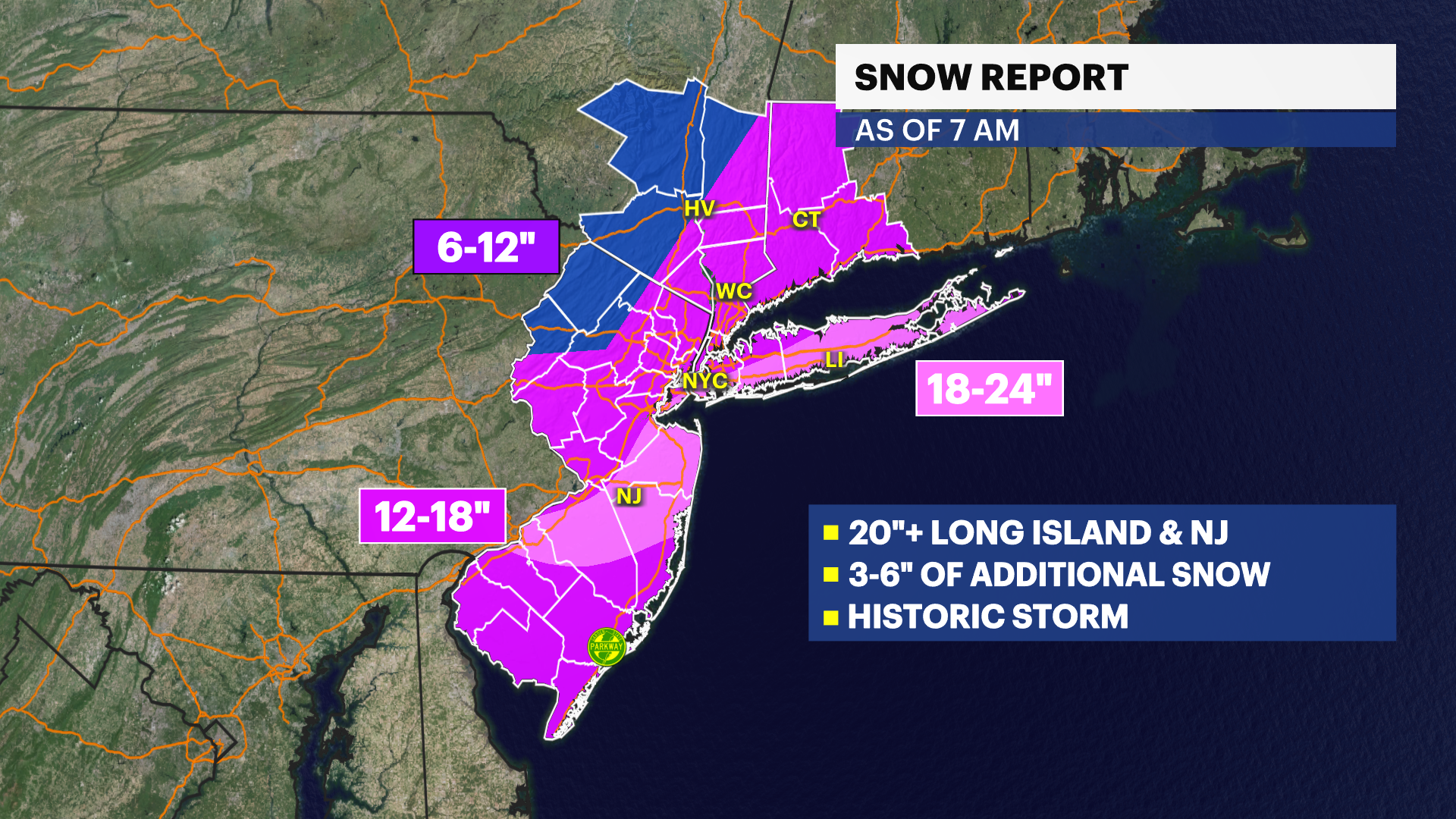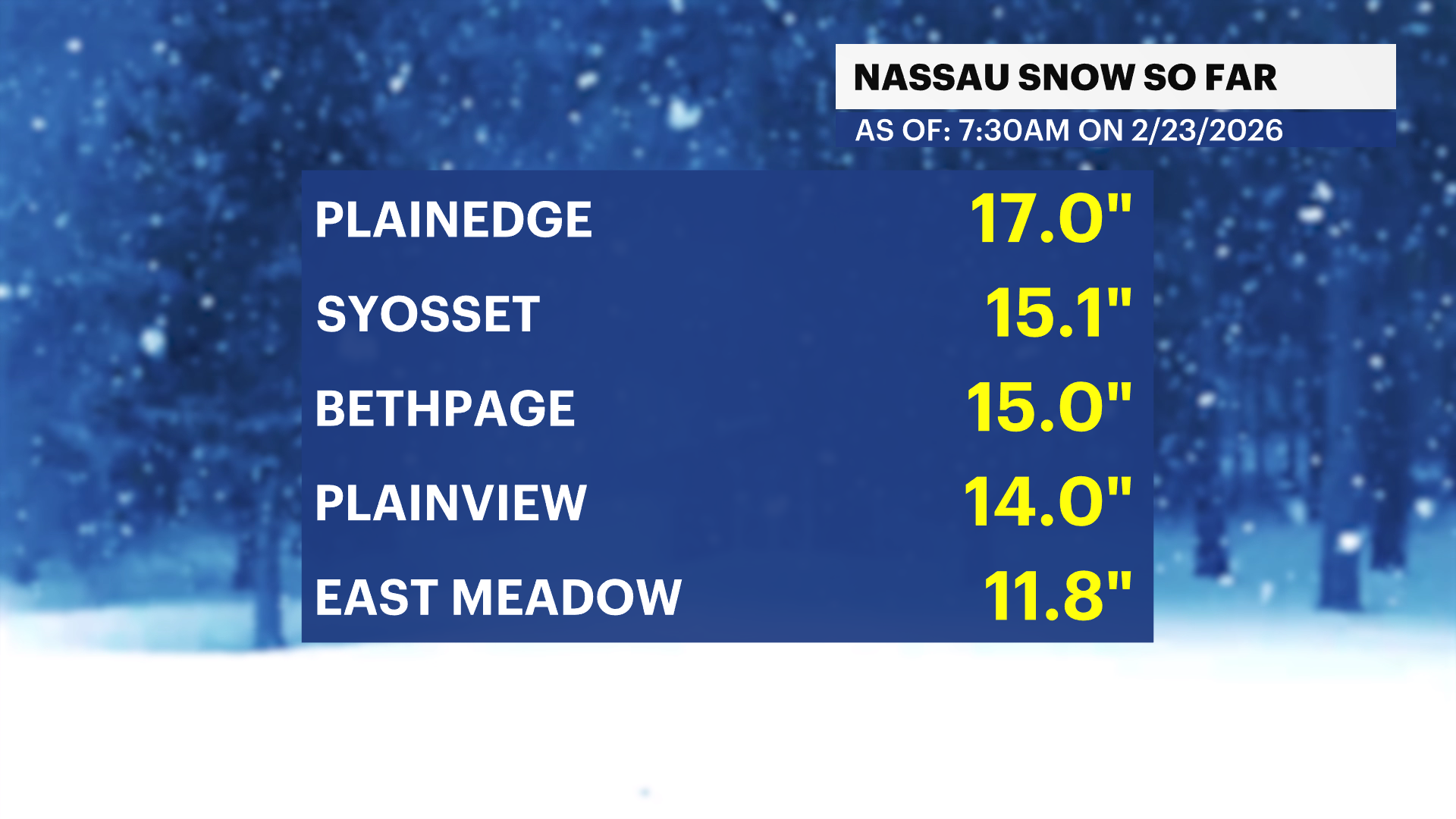 More than 20" of snow has fallen in Suffolk County. As of 7AM, Islip has reported it's 6th biggest snow on record. The all time biggest snow storm was in 2022 with 24.7" of snow. We are expecting to break that record.