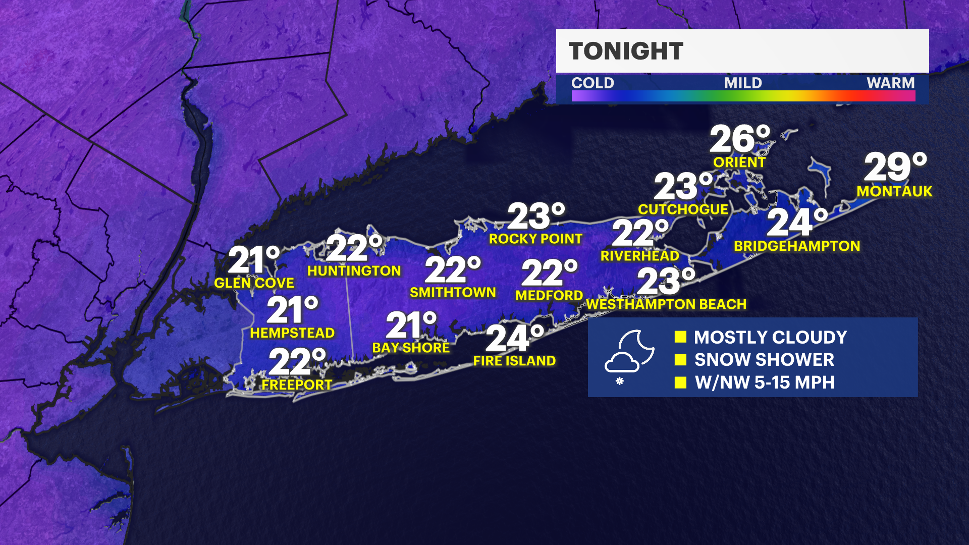 Tonight: A slight chance of snow showers. Mostly cloudy with a low around 21. Wind chill values between 15 and 20. West wind 5 to10 mph.