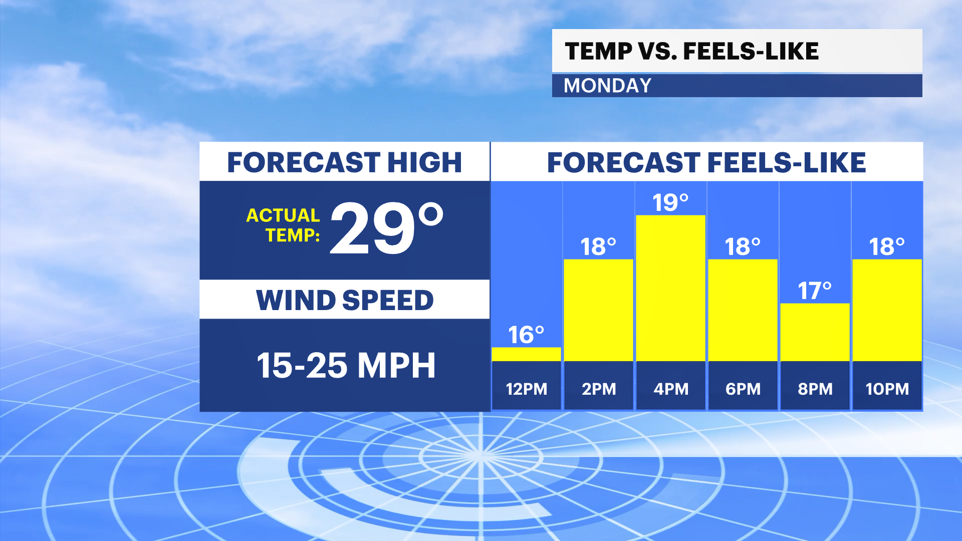 Tuesday night: Partly cloudy with a temperature rising to around 32 by 4 a.m. Wind chill values between 20 and 25. Southwest wind 5 to 15 mph.