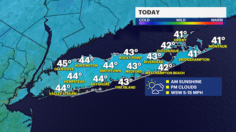 Cool temperatures with increasingly cloudy skies today on Long Island