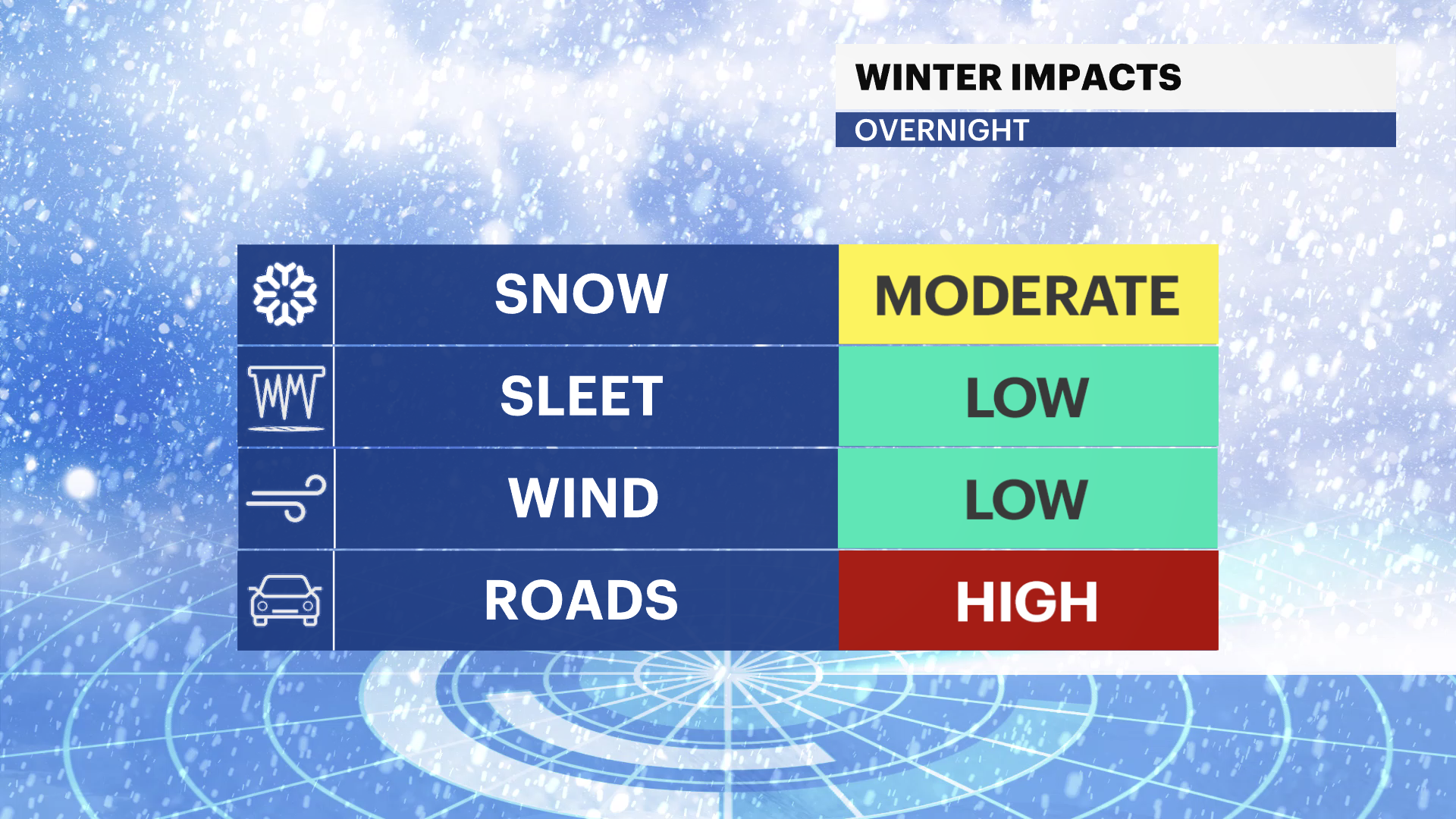OVERNIGHT: STORM WATCH — Periods of light to moderate snow taper off. Poor visibility to make for dangerous travel. Scattered power outages from the weight of snow on trees and power lines cannot be ruled out. Lows will be in the mid-20s. Wind: northeast 5 to 10 mph with some overnight gusts near 20 mph.