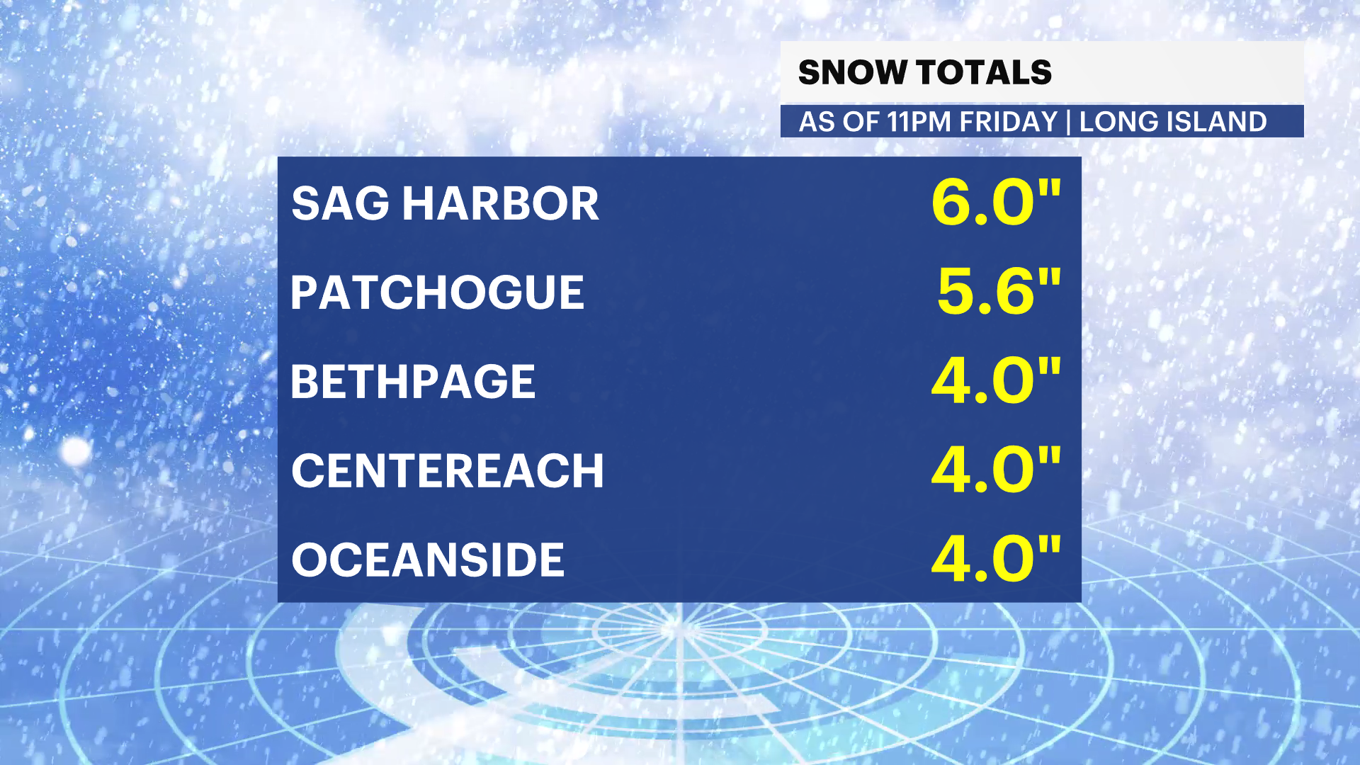 SNOW TOTALS: Most of Long Island will end up with 4 to 8 inches of snow by Saturday morning. Isolated higher amounts are possible for Eastern Suffolk County.