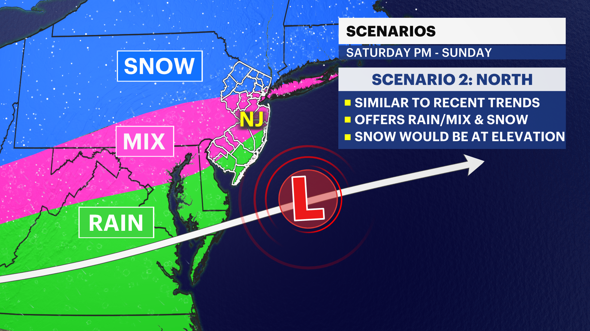 If the storm takes a more northerly track, the second scenario, it could pout the center closer to the garden state which could encourage a wintry mix within the storm as it impacts New Jersey, leaving mostly snow for north and northwestern spots.