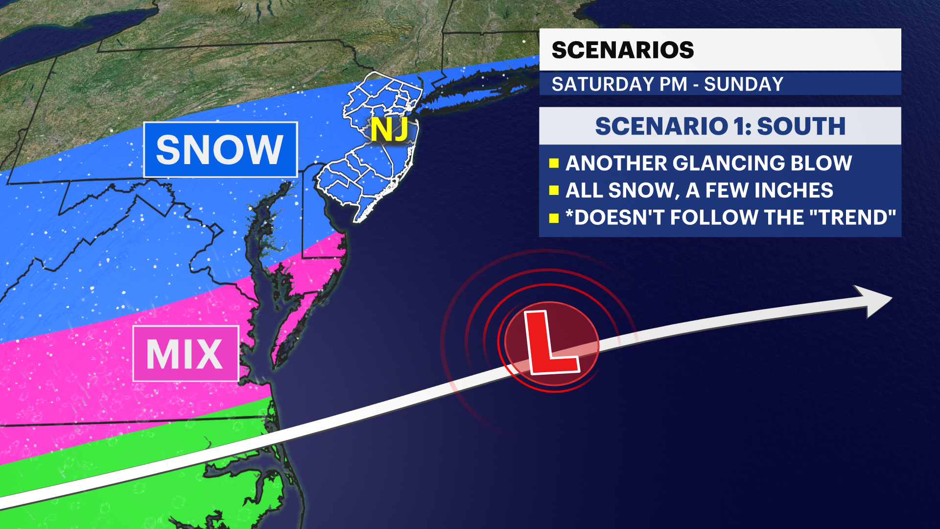 The storm this weekend is highly variable and track dependent. The storm is currently tracking to our south, which is our first scenario, and a south track would put New Jersey in the risk of experiencing a glancing blow of a few inches of snow.