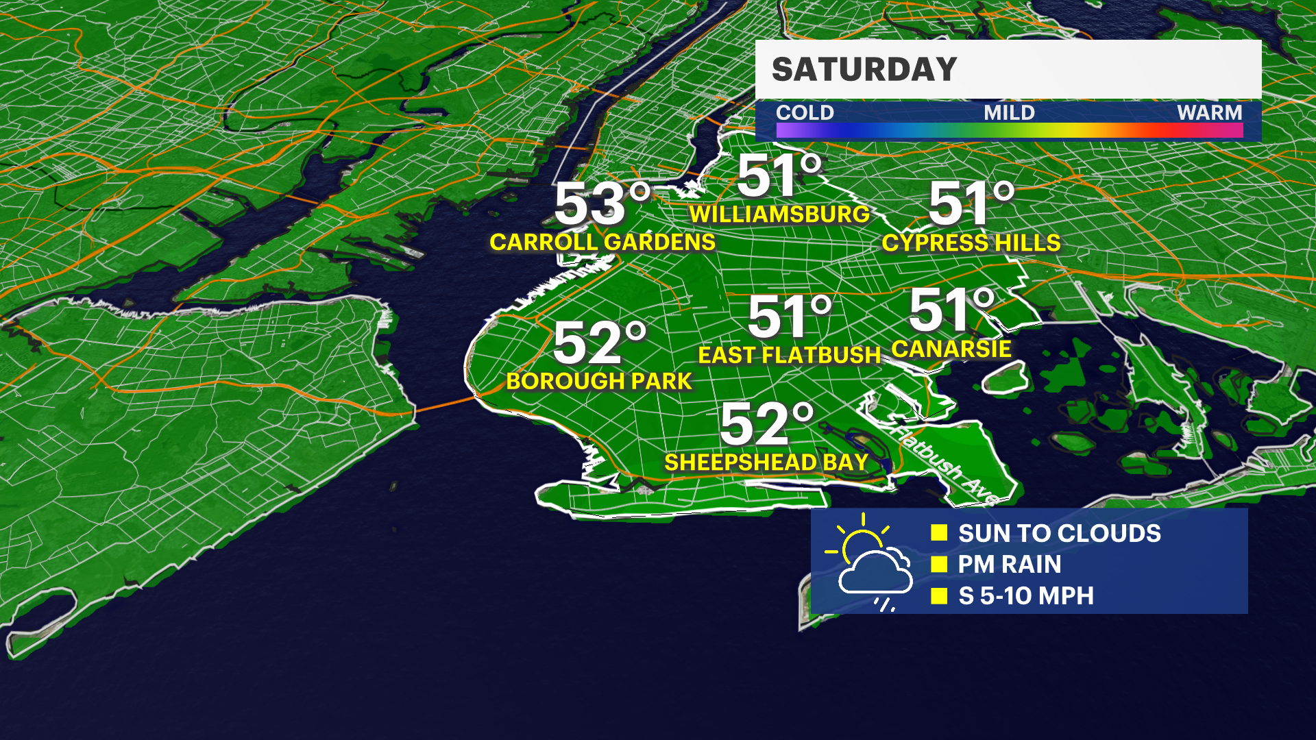 SATURDAY: Nice start, soggy finish. Rain and wind return by Saturday night. Highs in the low 50s, lows in the higher 40s.