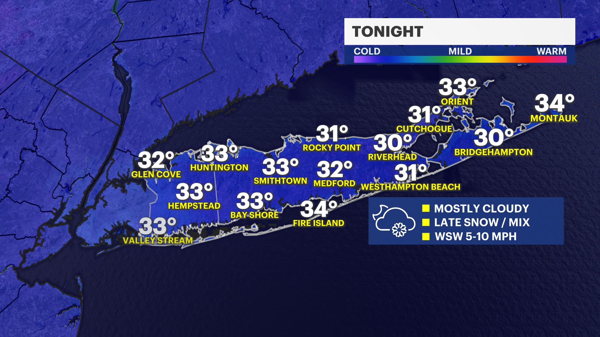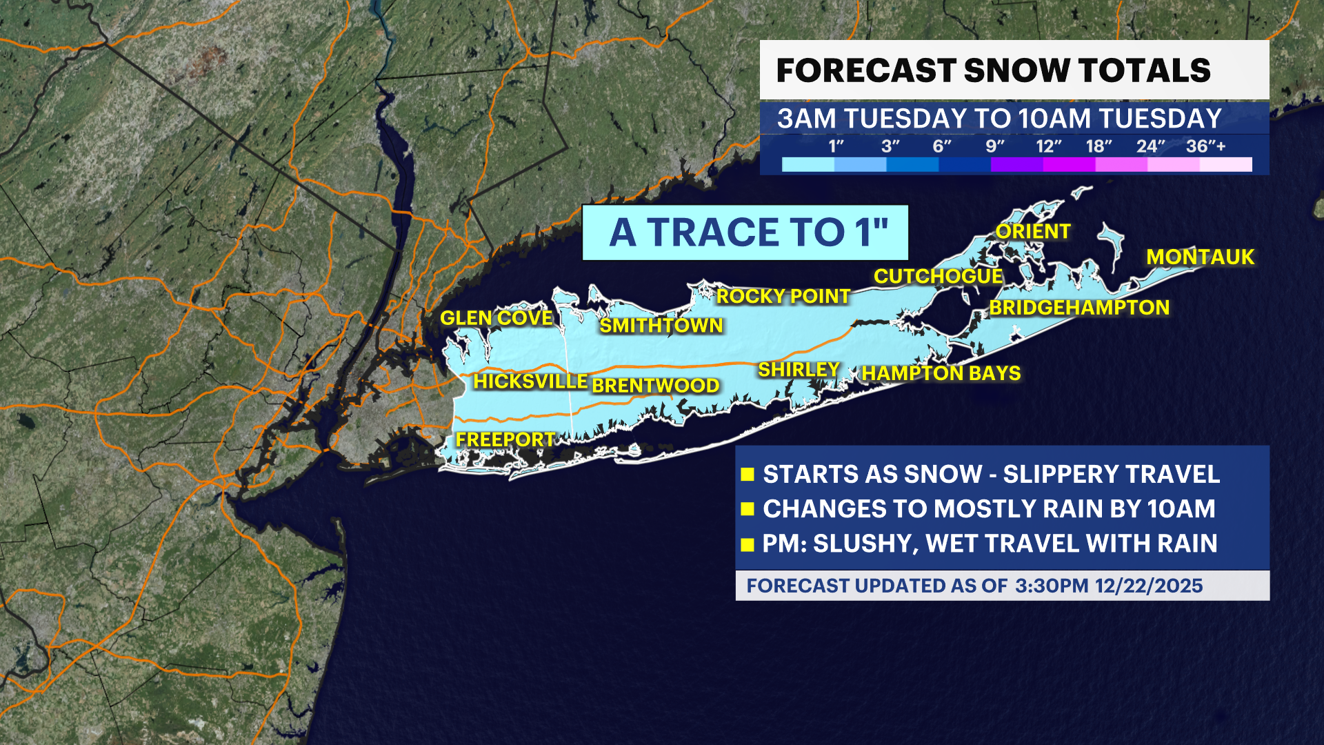 If you live on the immediate South Shore or East End of Long Island, you will experience a very fast change to rain. Do not expect much more than a trace on the ground in these areas before even that gets washed away, but travel will still be wet and slick.