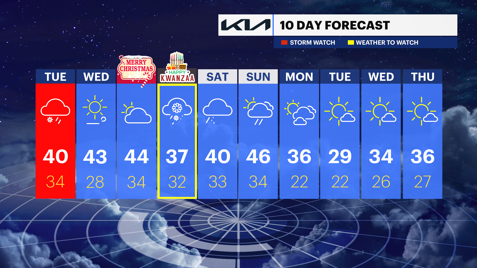 FRIDAY: STORM CHANCE — KWANZAA — Cloudy in the morning with snow possibly developing in the afternoon. A few inches of snow can be possible Friday p.m. through early Saturday. There is the chance for some mixing as well. Stay with News 12 for updates on this throughout the week. Highs near 37 degrees. Lows near 32 degrees.