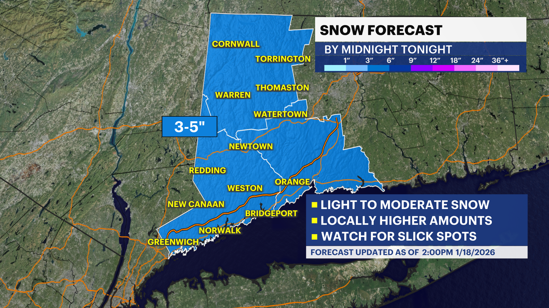 Snow showers continue this evening, with 2–4 inches of accumulation for most areas and a few higher totals before snow ends between 10 p.m. and midnight.