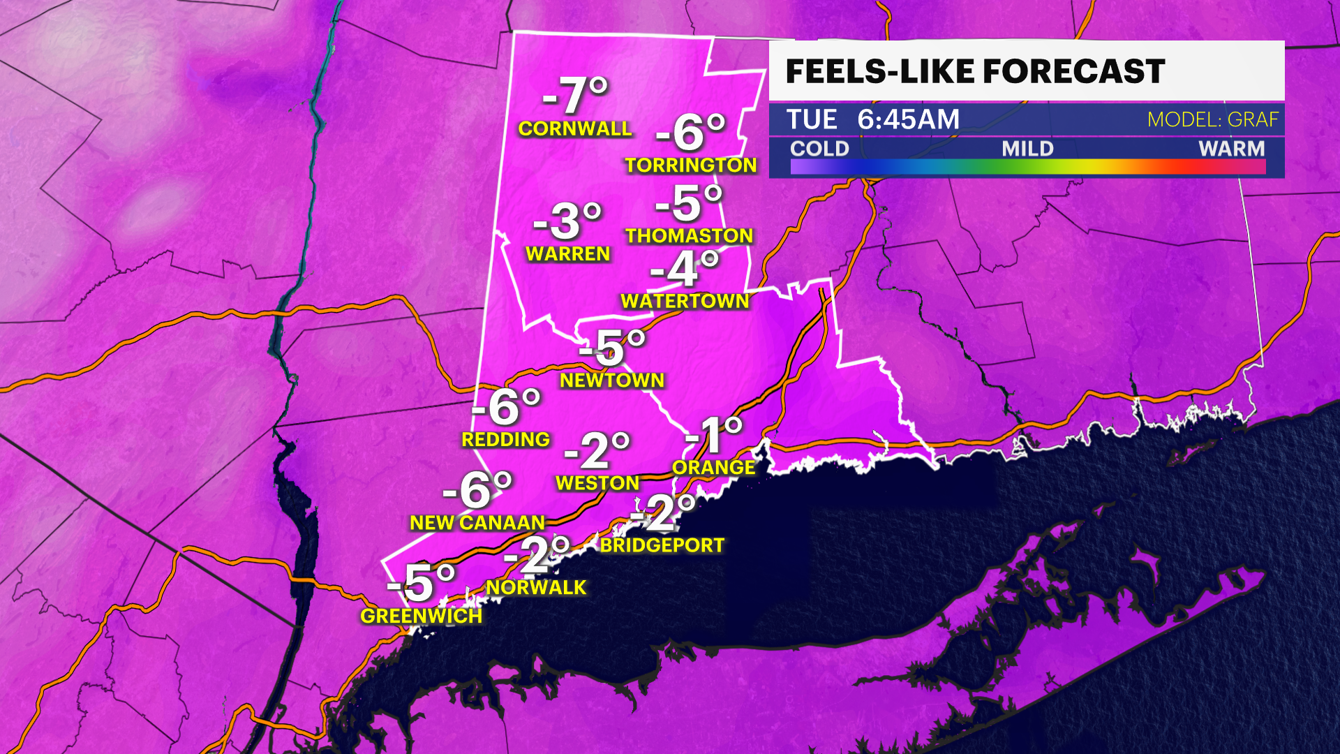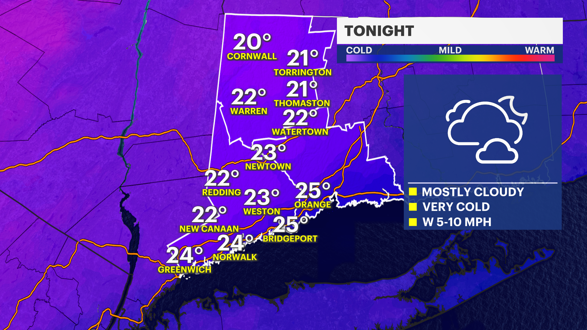 Tuesday: Sunny but very cold. Temperatures range from the low teens to the low 20s.