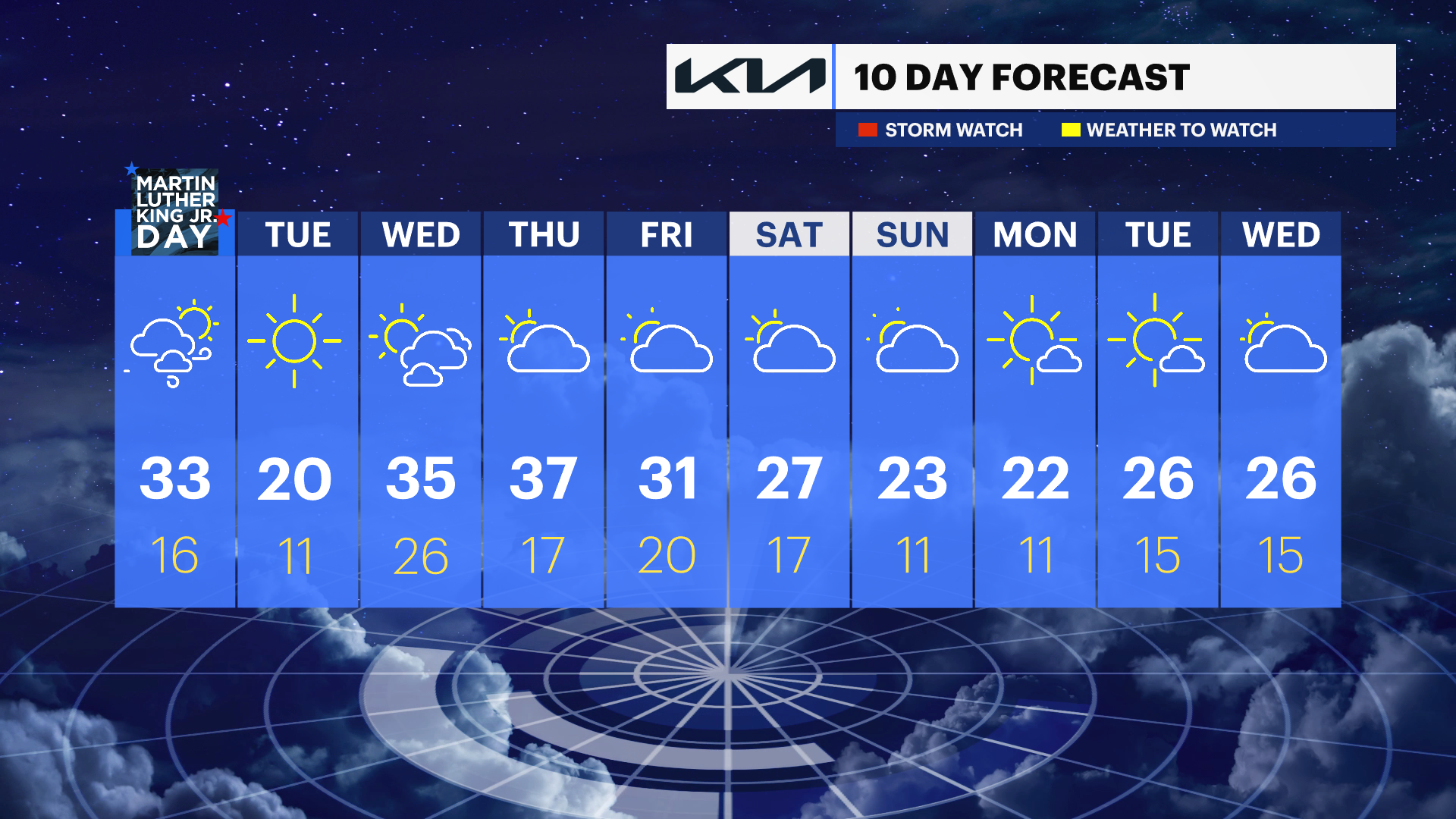 Monday (MLK Day): Mostly sunny, colder, and windy in the evening. Temperatures range from the upper teens to the low 30s. Wind chill values will be in the teens.