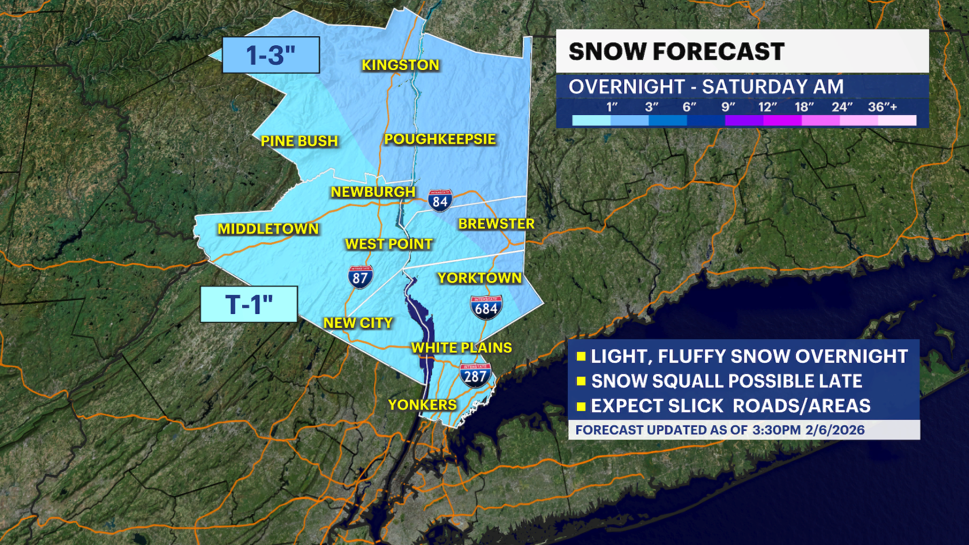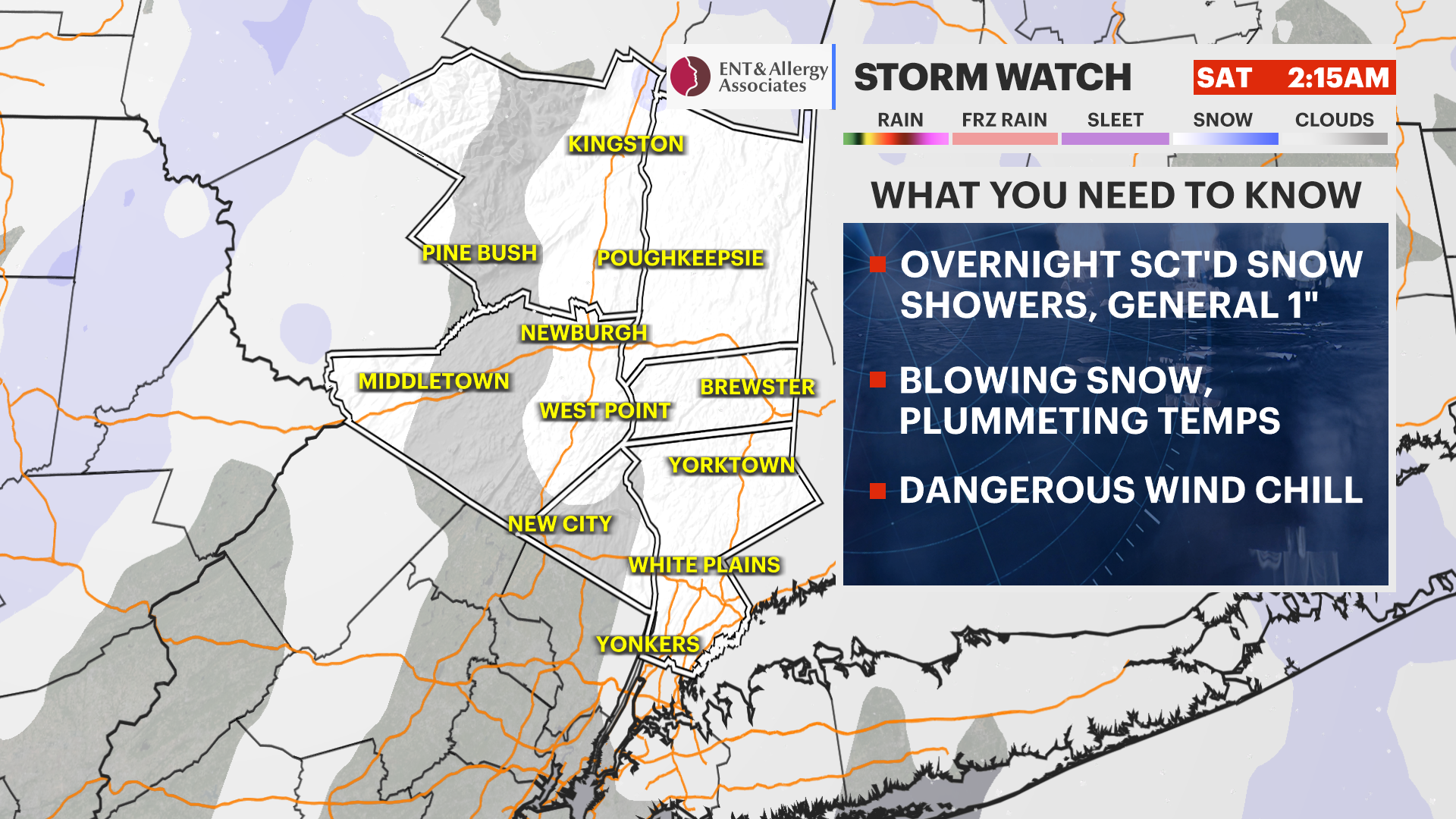 A quick moving clipper drops about an inch or so of snow for most places in the Hudson Valley but there could be a few that get overnight snow showers, bringing 1 to 3 inches.