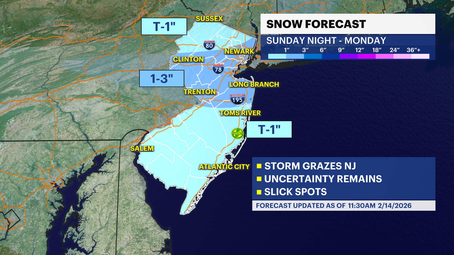 The eventful part of the forecast is Sunday night with a round of light rain/snow showers that pass overnight for most of the state. The impacts are minor, and the precipitation will be done around sunrise on Monday. 1-3 inches of wet snow is possible north of I-195 and south of I-80, but many other spots end up even lower than this range with less than 1 inch.