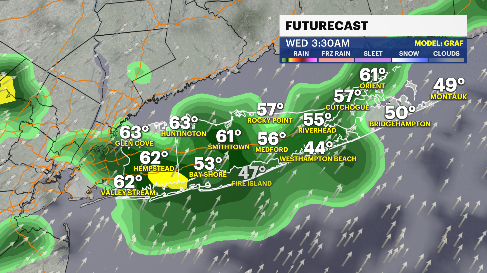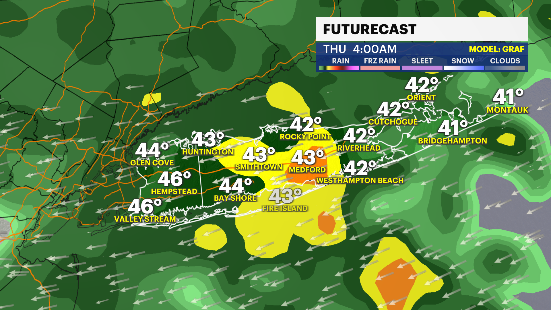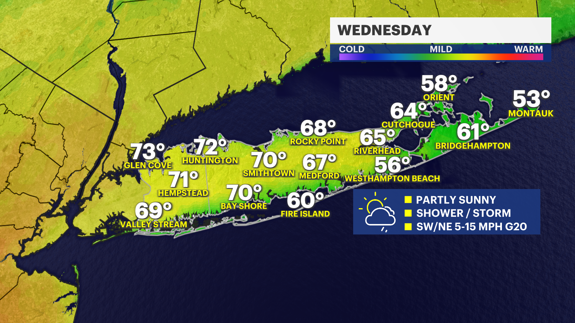 WEDNESDAY: PASSOVER - APRIL 1 - Partly sunny with spotty rain showers. A spotty non-severe thunderstorm is possible in the afternoon and through the overnight period. High temperatures will range again. An average high temperature of near 68 degrees is expected. It will be cooler along the South Shore and East End. It will be warmer - in the 70s - along the North Shore of Nassau and western Suffolk Counties. Overnight lows near 45 degrees.