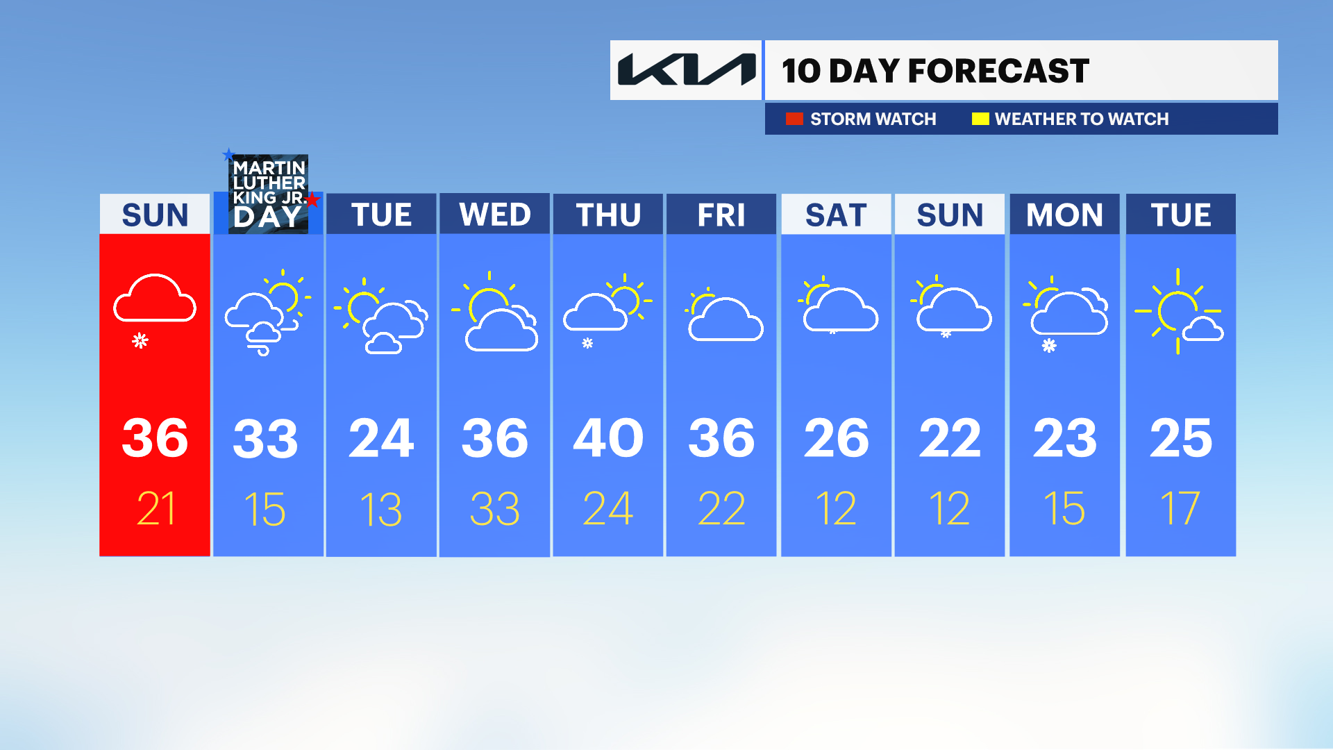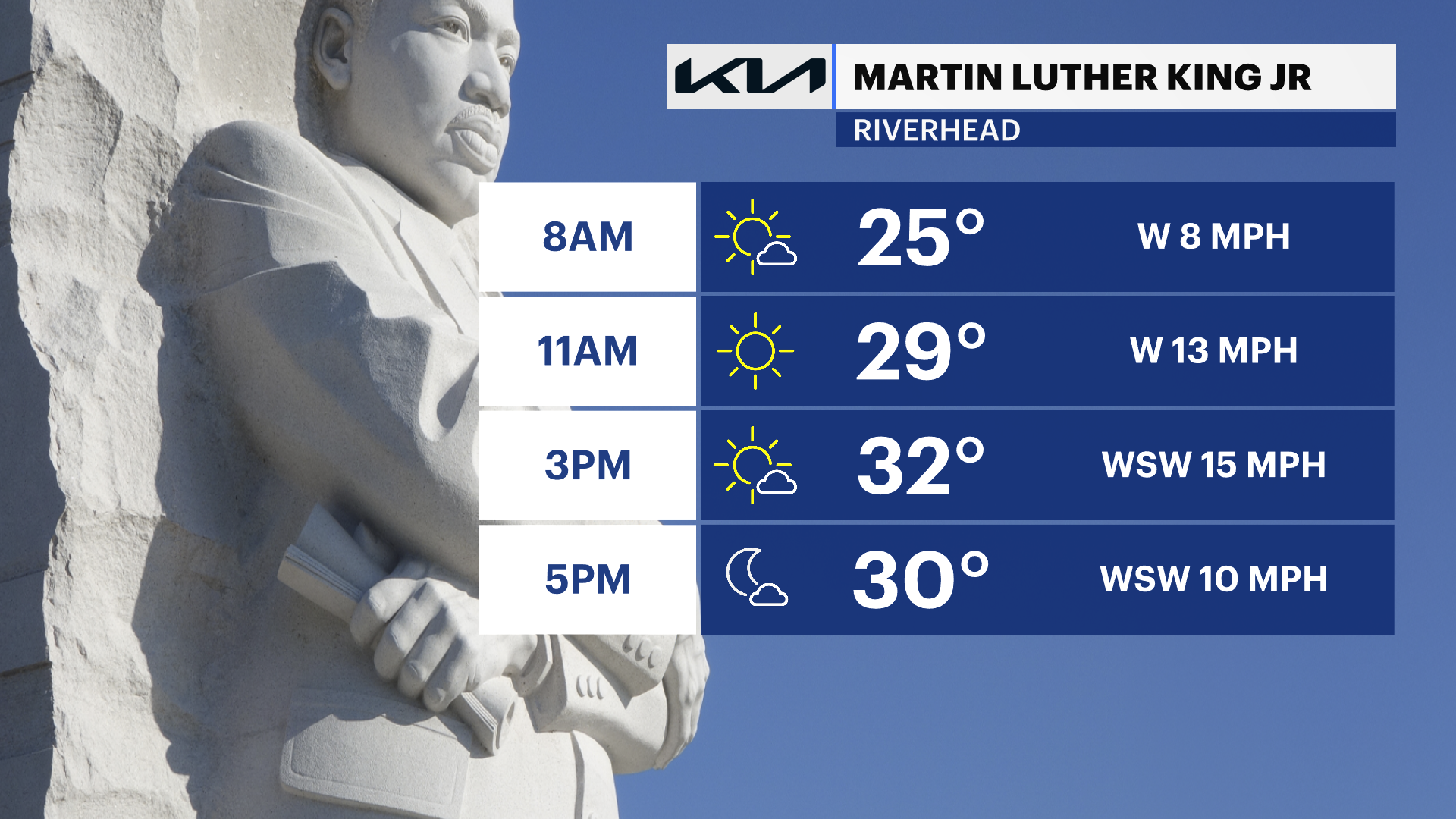 Martin Luther King Jr. Day on Monday is dry and sunny but becoming breezy and cold in the afternoon. Temperatures will remain below average for the work week, particularly cold on Tuesday.
