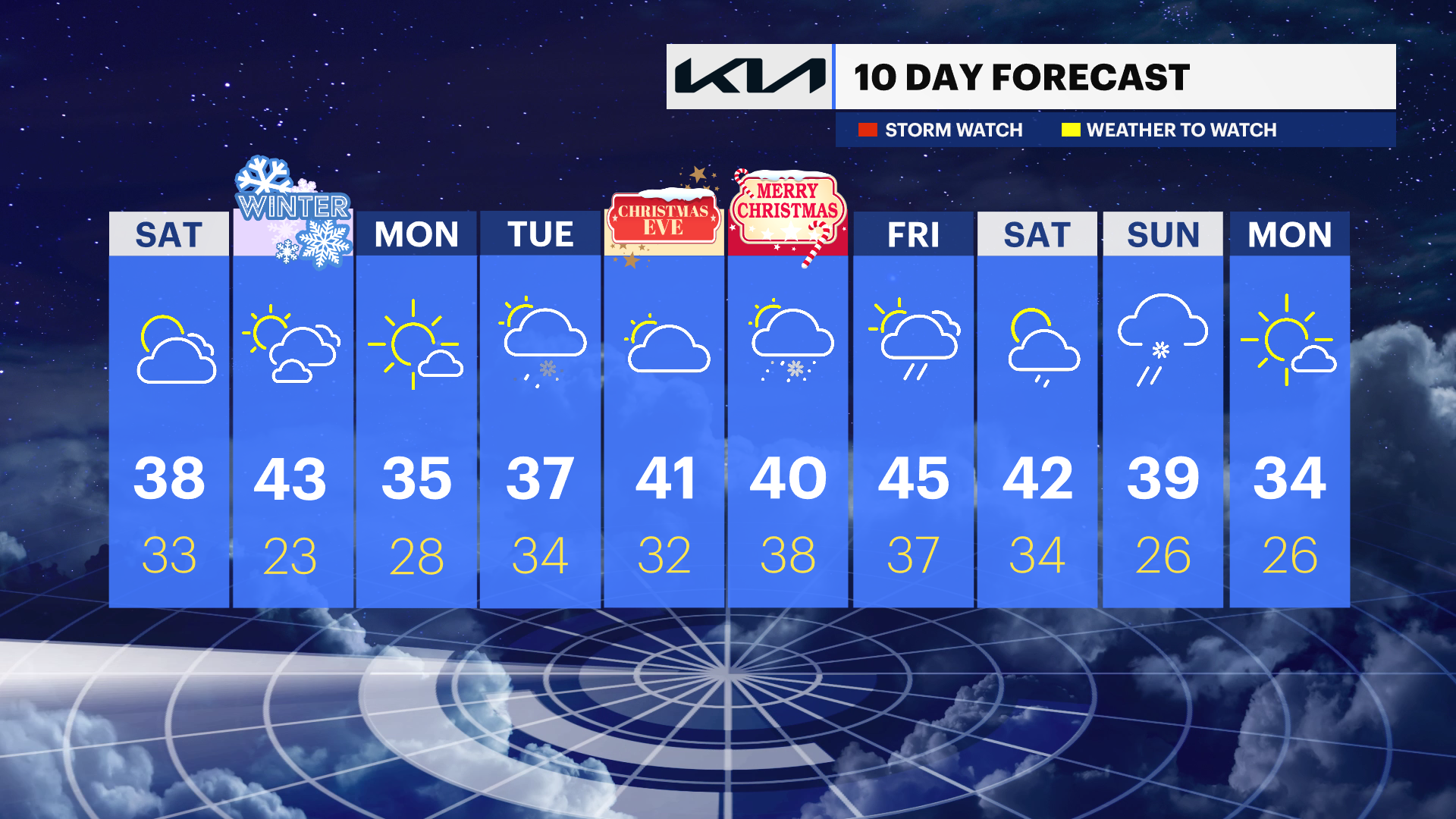 For the holiday, a milder trend takes hold. Christmas Eve and Christmas Day will see temperatures reach the upper 40s to near 50 degrees, with a chance of rain.