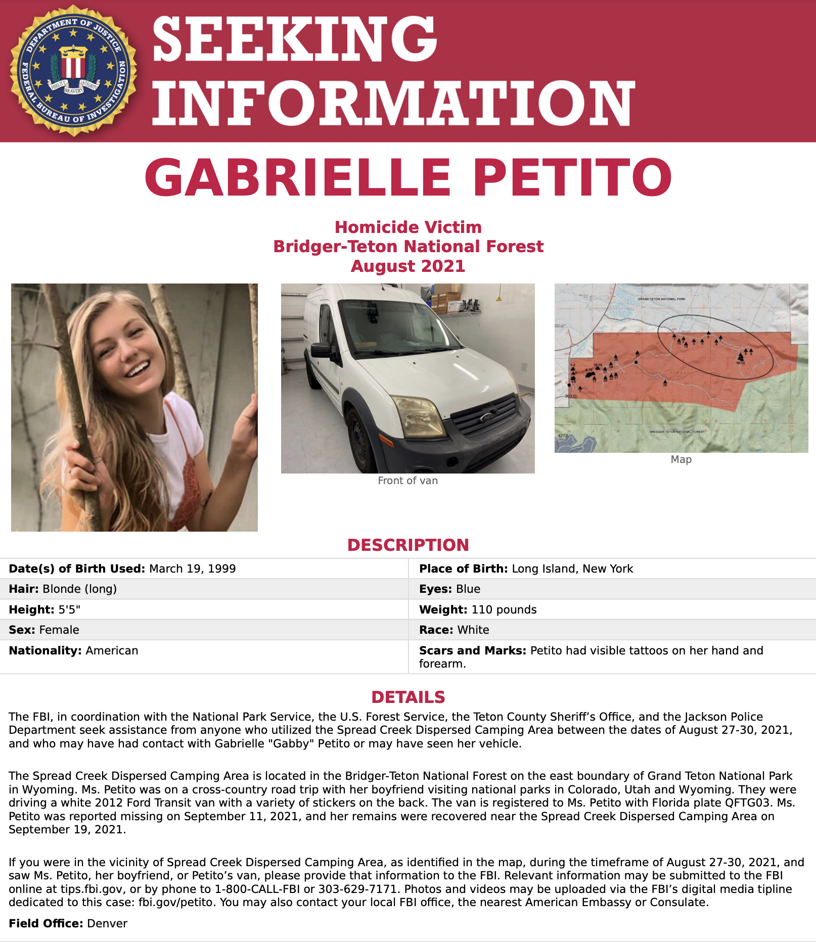 The FBI says it is now seeking information from anyone who utilized the Spread Creek Dispersed Camping Area in Wyoming’s Grand Teton National Park between the dates of Aug. 27-30, 2021, who may have had contact with Petito or Laundrie, or who may have seen their vehicle.