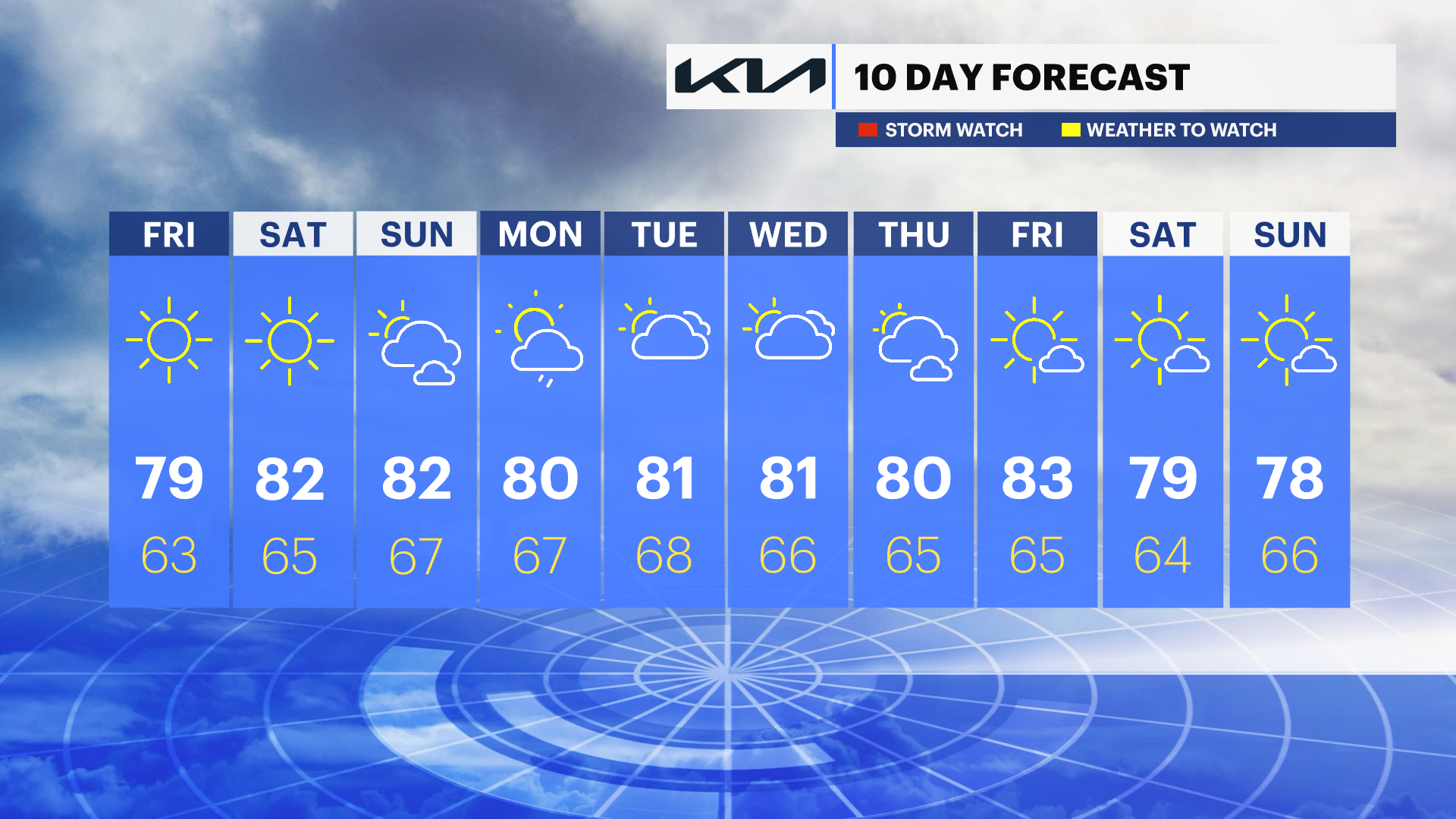 SATURDAY: Mostly sunny and warm. Highs near 82. Lows near 65.