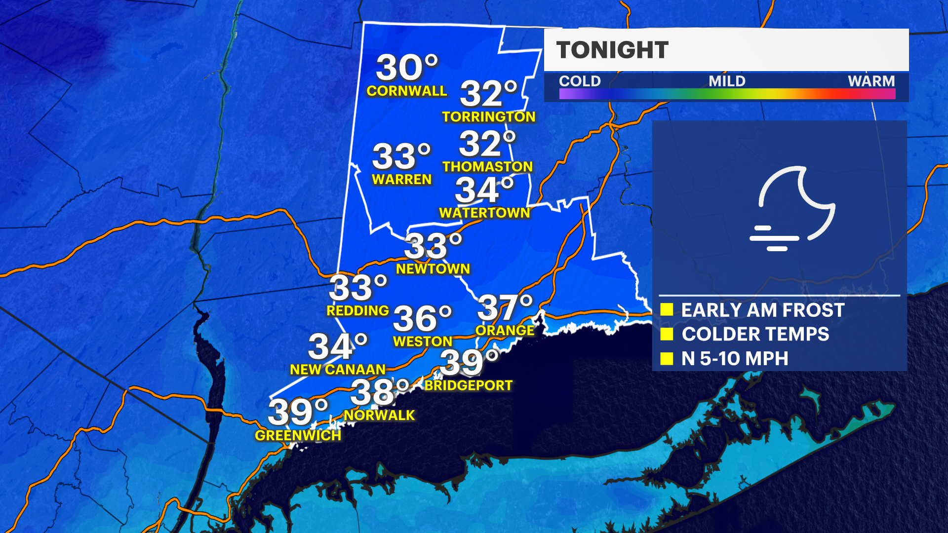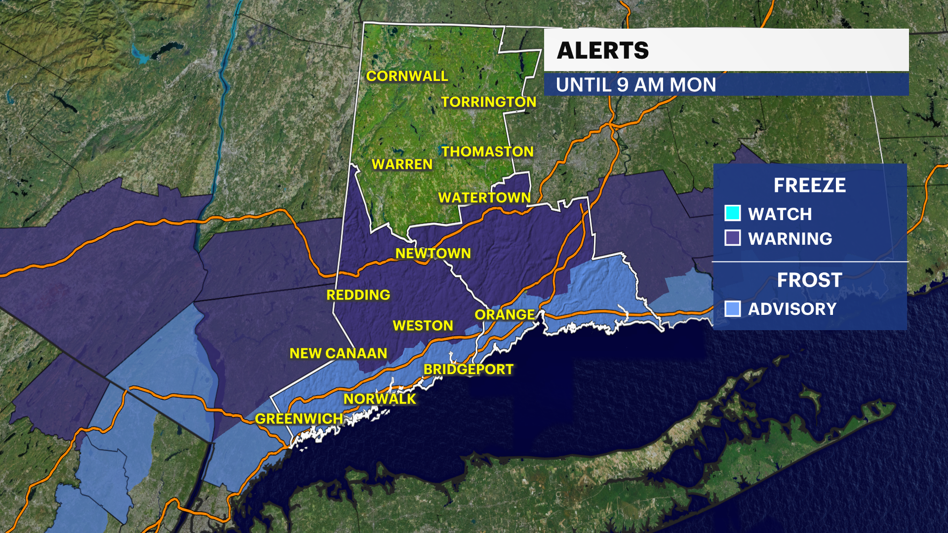 FREEZE WATCH & WARNING IN EFFECT for northern Fairfield and New Haven counties tonight into Monday morning.
