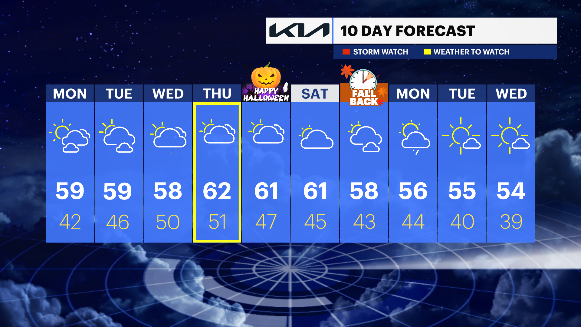 TONIGHT: Partly cloudy with patchy fog. Lows in the upper 40s.