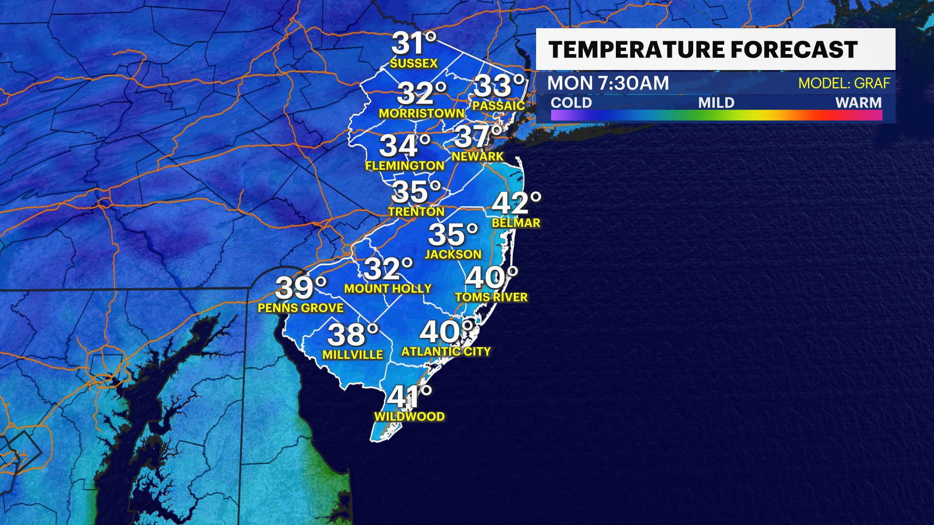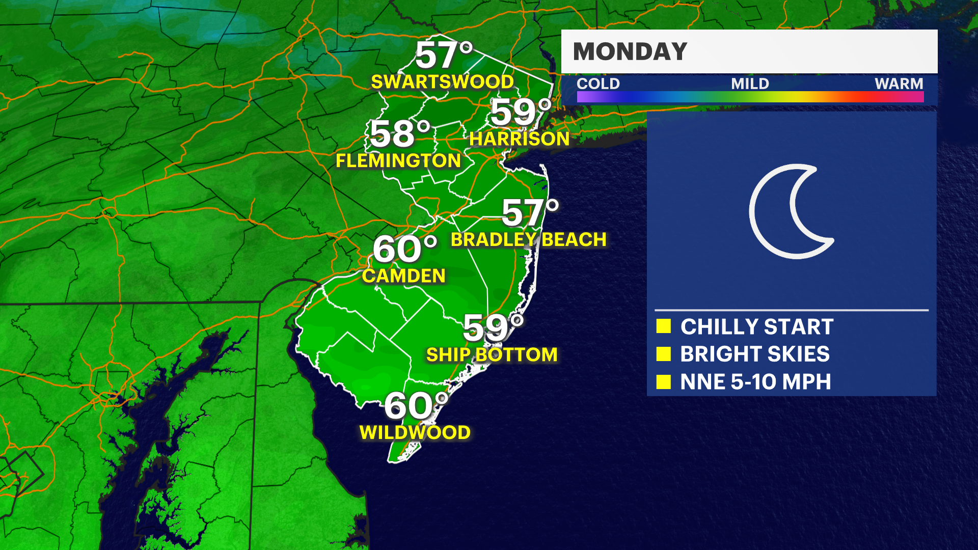 MONDAY: More clouds. Highs in the low to mid 50s.