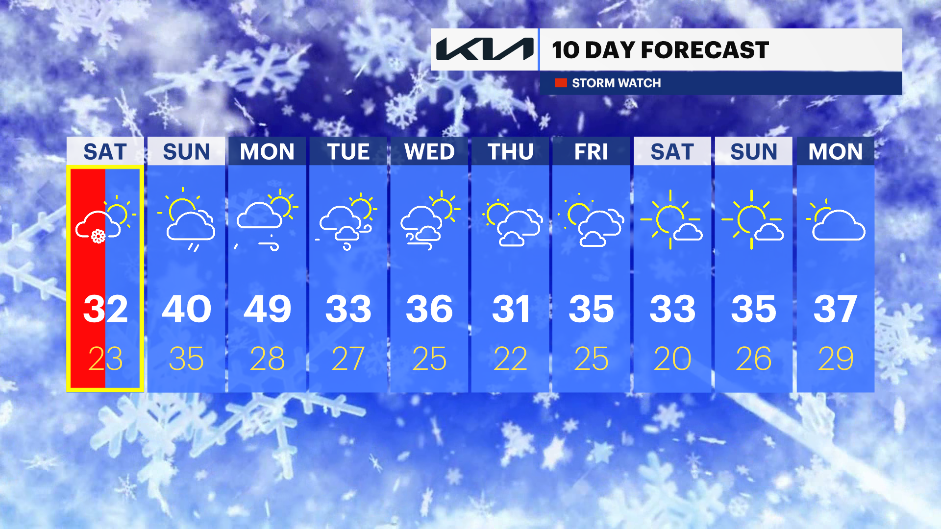 SATURDAY: STORM WATCH - Snow wraps early on to mostly cloudy skies. Highs: low-30s. Lows: upper-20s.