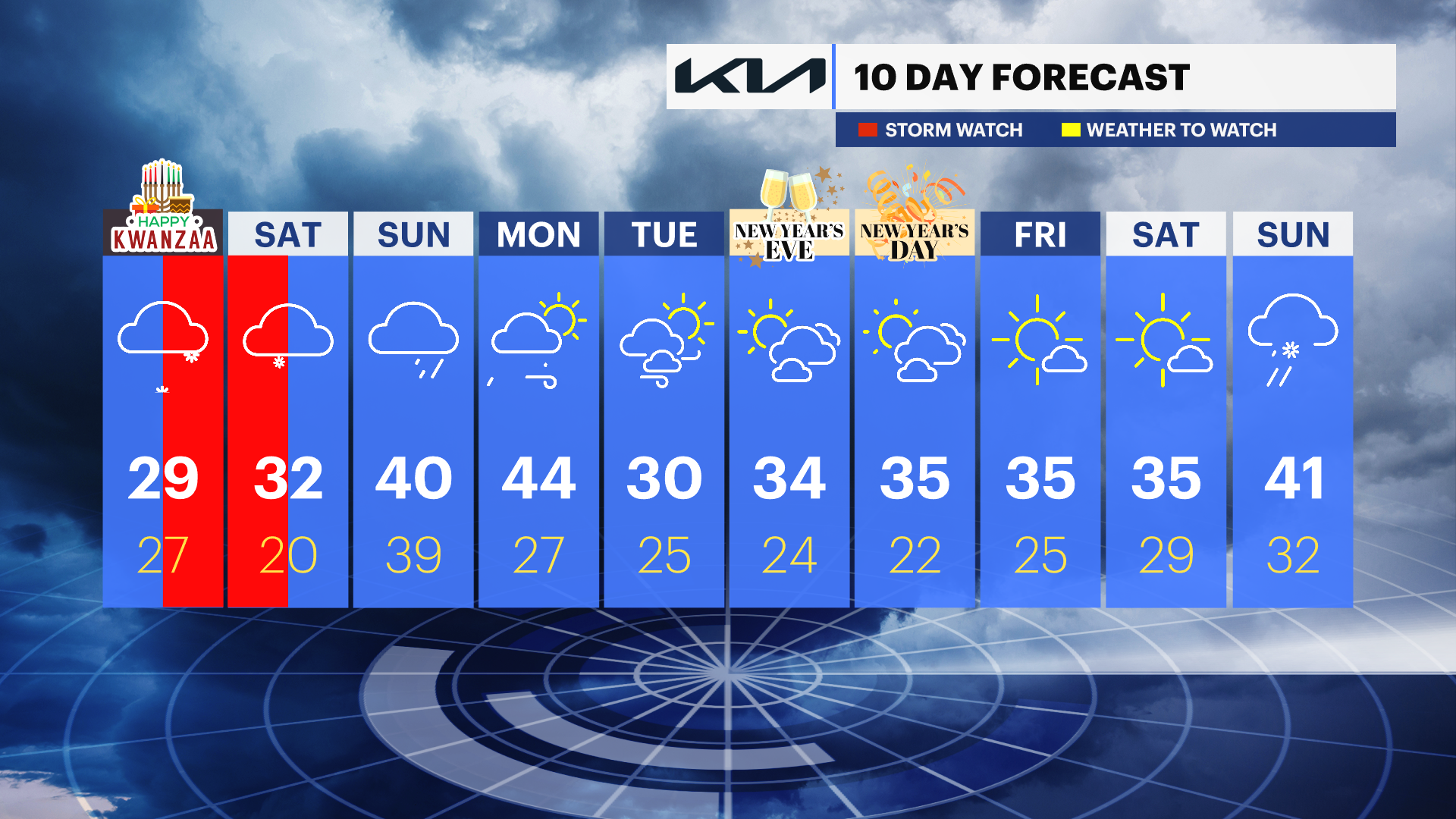 THURSDAY: NEW YEAR'S DAY - Mix of sun and clouds. Highs: upper-20s to low-30s. Lows: low-20s.