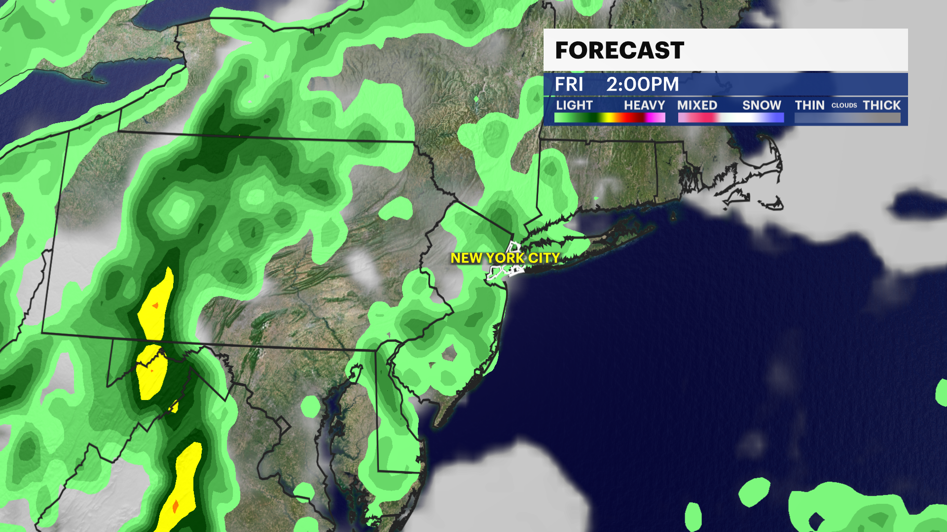 Friday: Partly sunny, still warm and humid. Chance of storms. Highs near 85. Lows near 72.