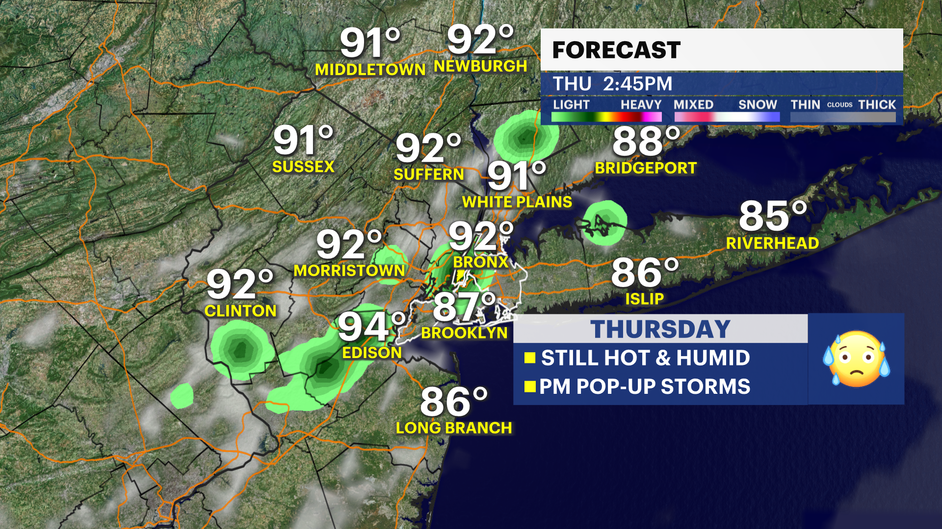 Storm Watch Team Meteorologist Hope Osemwenkhae says there is a heat advisory in effect for New York City through Wednesday 8 p.m. Feel-like temperatures will be in the mid-90s due to the heat and humidity.