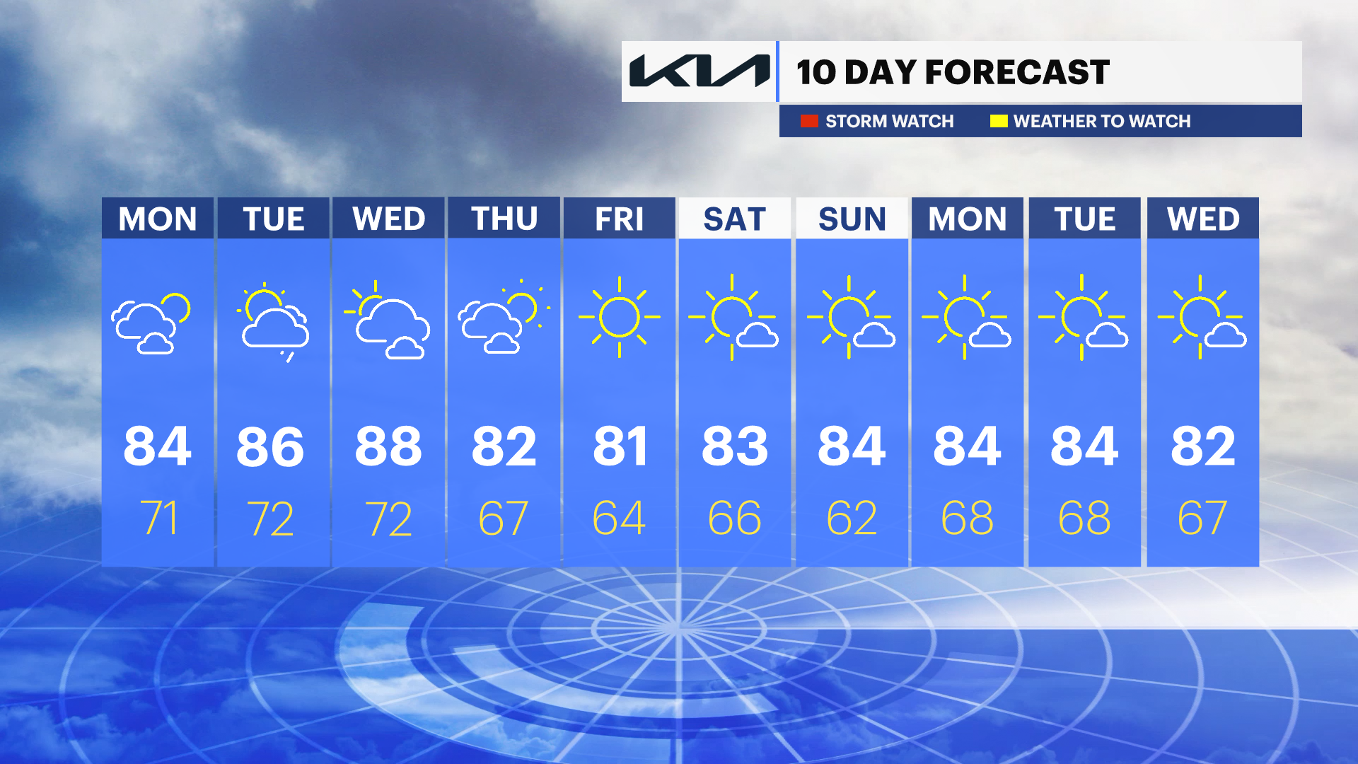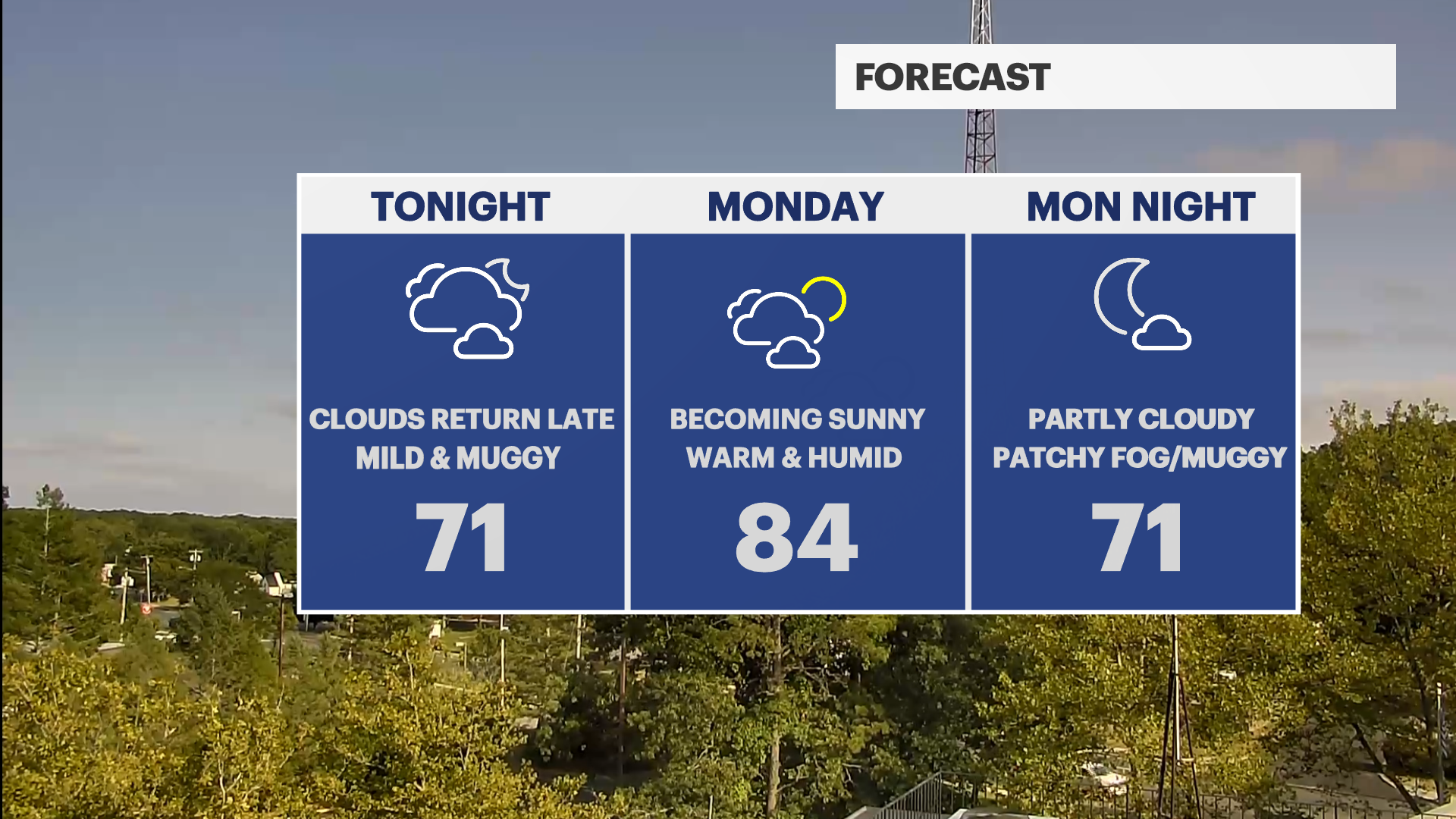 MONDAY: Warm and humid with morning clouds that will give way to afternoon sunshine. Highs near °84.