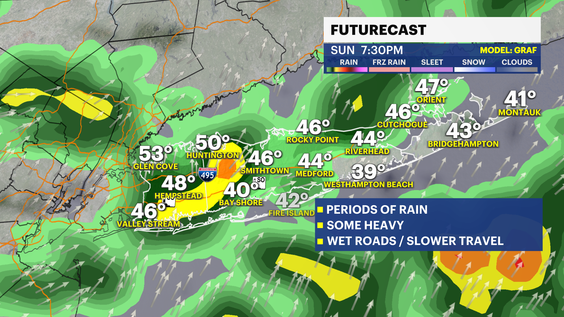 By Thursday, it warms up with highs in the mid-50s with parts of Nassau county reaching the 60s, but clouds will be more stubborn throughout the day. That sets the stage for our next system, bringing rain in by Thursday night and continuing into Friday morning. After that clears out, the weekend is shaping up nicely — plenty of sunshine, though it will be a bit on the chilly side with highs staying in the 40s.