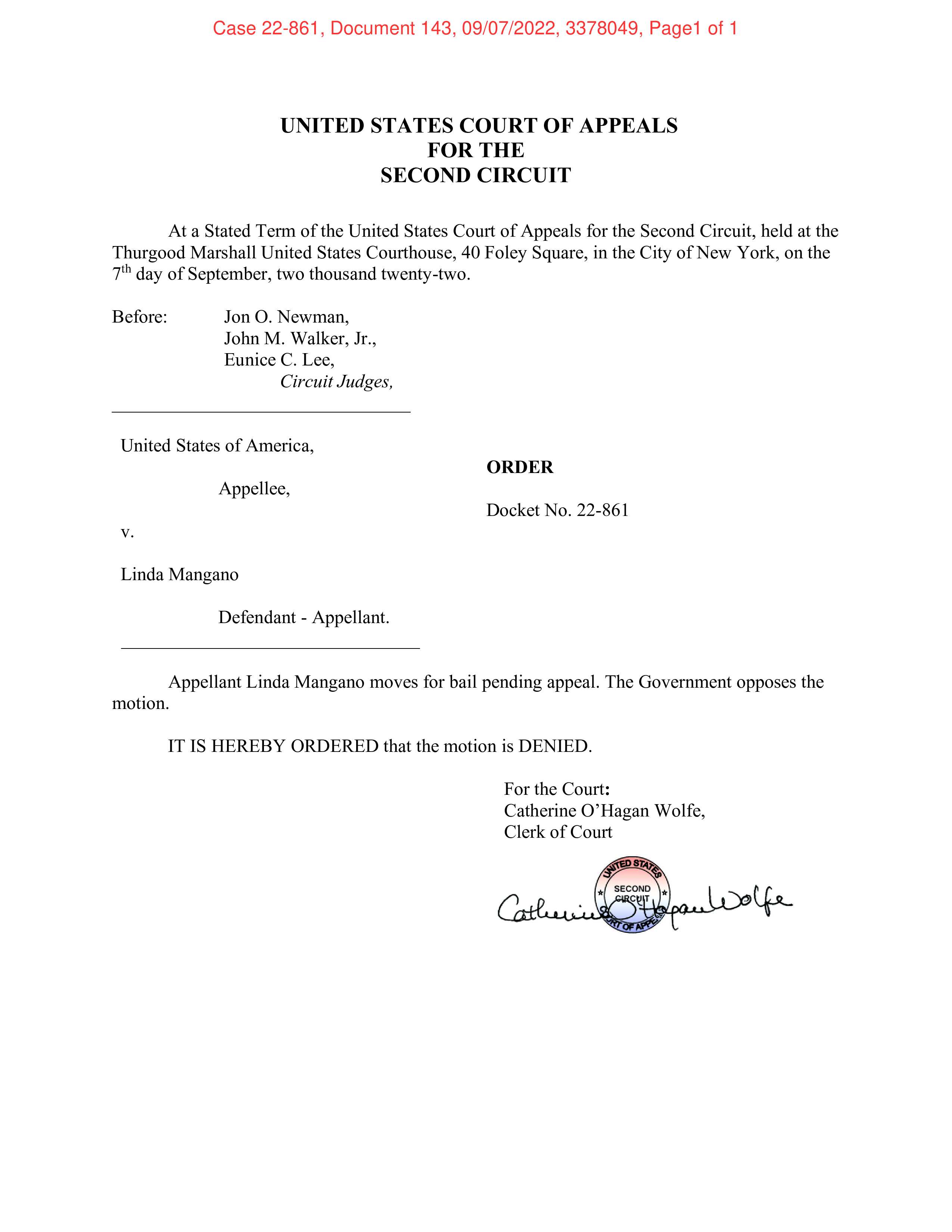Linda Mangano's request for bail has been denied by the United States Court of Appeals for the Second Circuit.