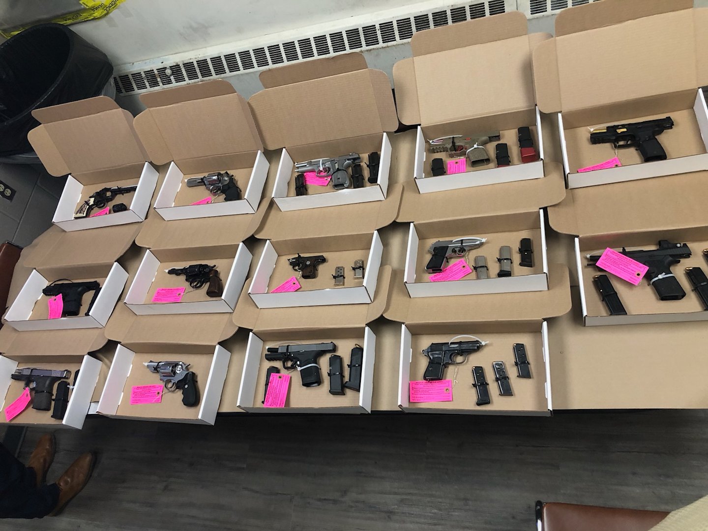 Investigators recovered eight assault rifles, 10 semi-automatic handguns and four revolvers, as well as multiple ammunition feeding devises.