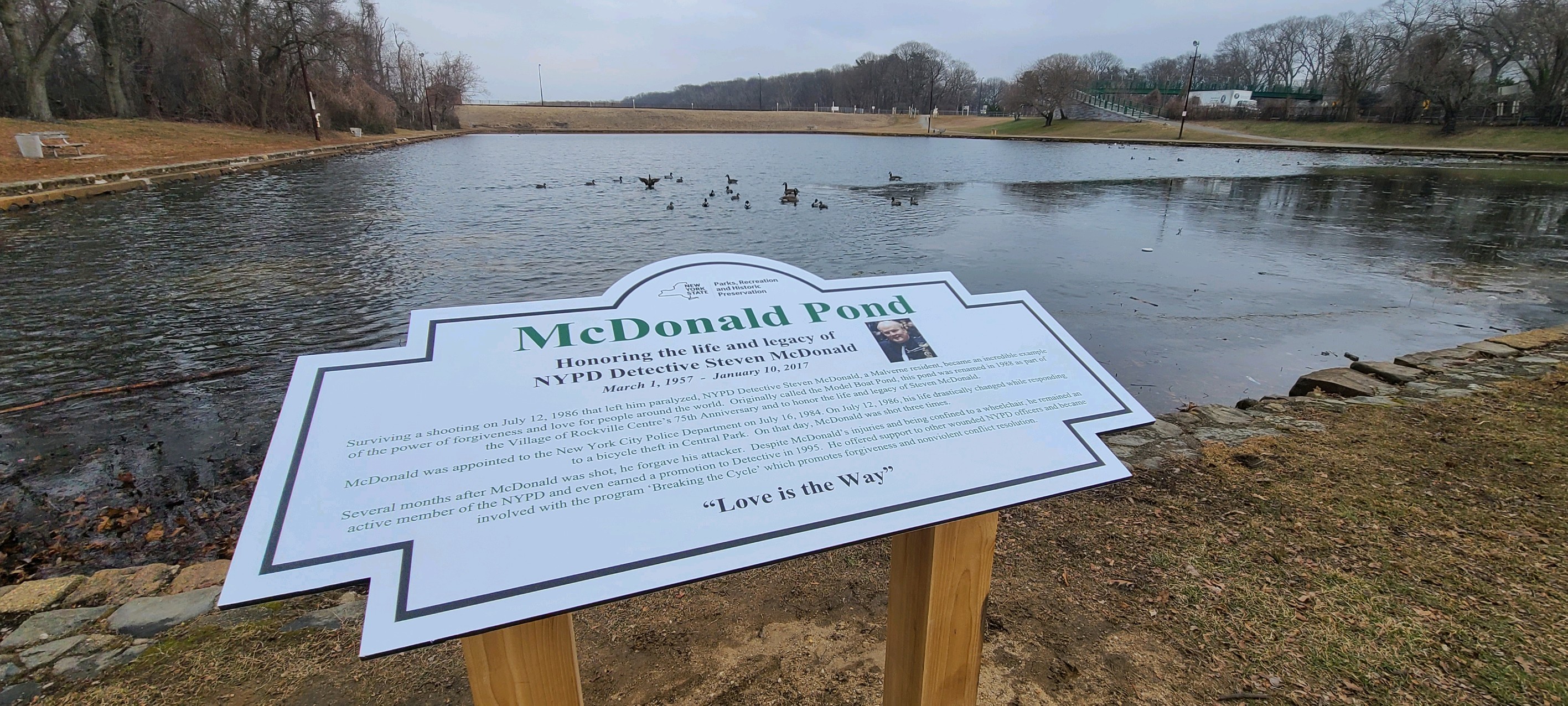 In July 1986, NYPD Officer Steven McDonald was shot and paralyzed. When he returned home, they honored him by renaming the pond at Hempstead Lake State Park, the McDonald Pond.
