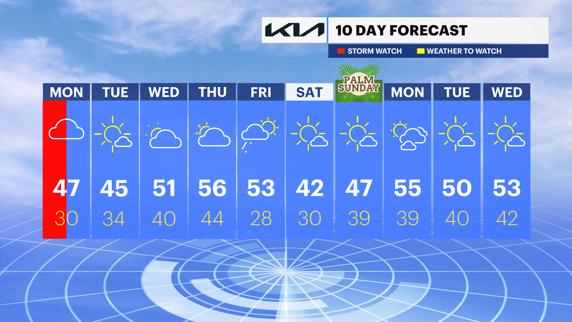 Looking ahead to Tuesday, sunshine makes a return with mostly sunny skies and a high temperature near 40 degrees. The warming trend continues beyond that, with temperatures climbing back into the 50s by Wednesday and Thursday, giving us a nice taste of milder spring weather.