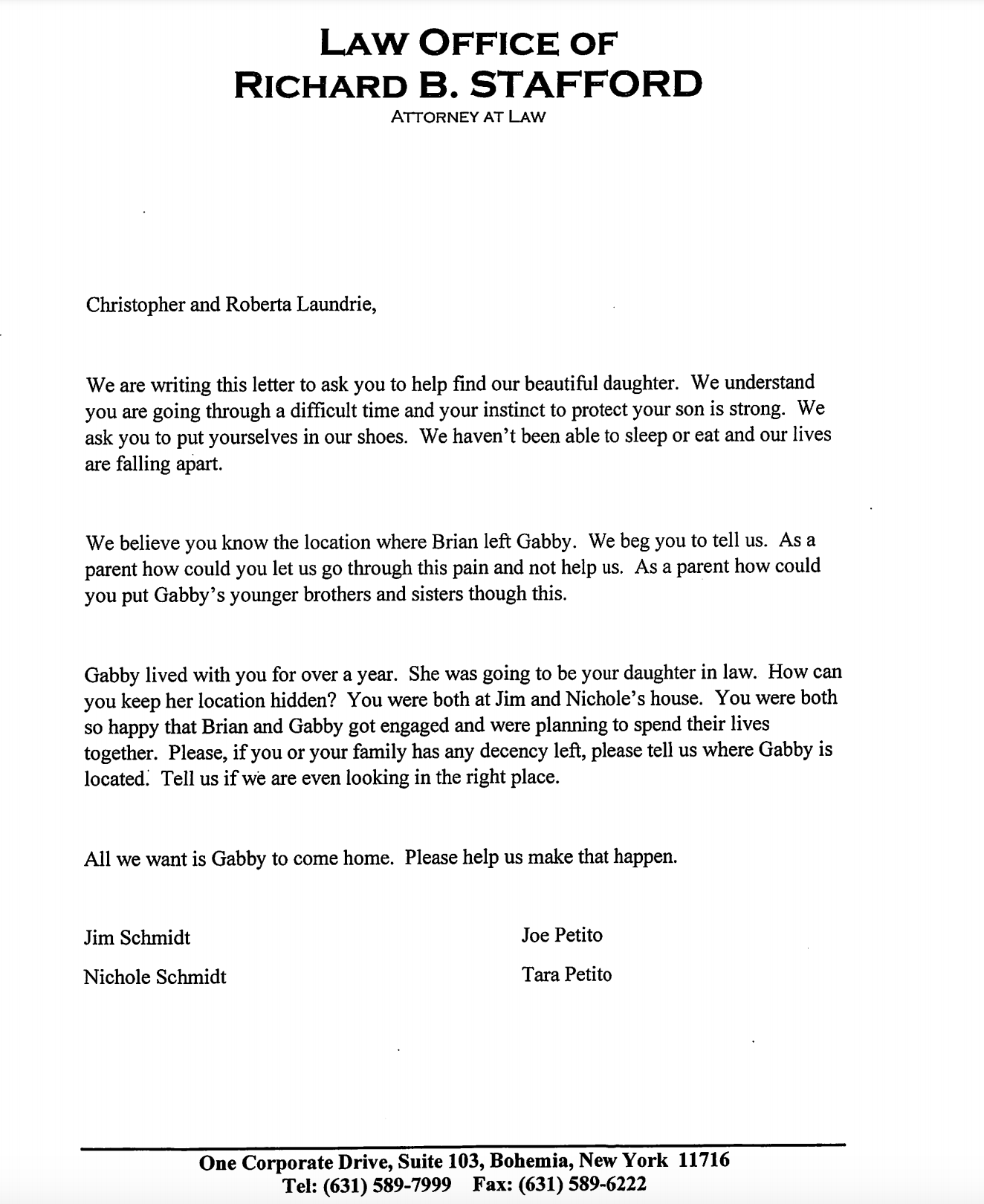 The Petito and Schmidt family released a statement Thursday pleading with the Laundrie family to help them find Gabby.
