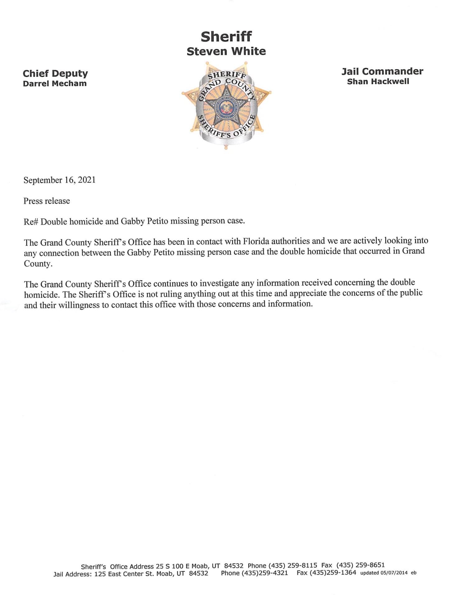 The Grand County Sheriff's Office in Utah says they're actively looking into any connection between Gabby's disappearance and the double murder of a couple who was last seen in Moab on August 13. That's just one day after the video was recorded.