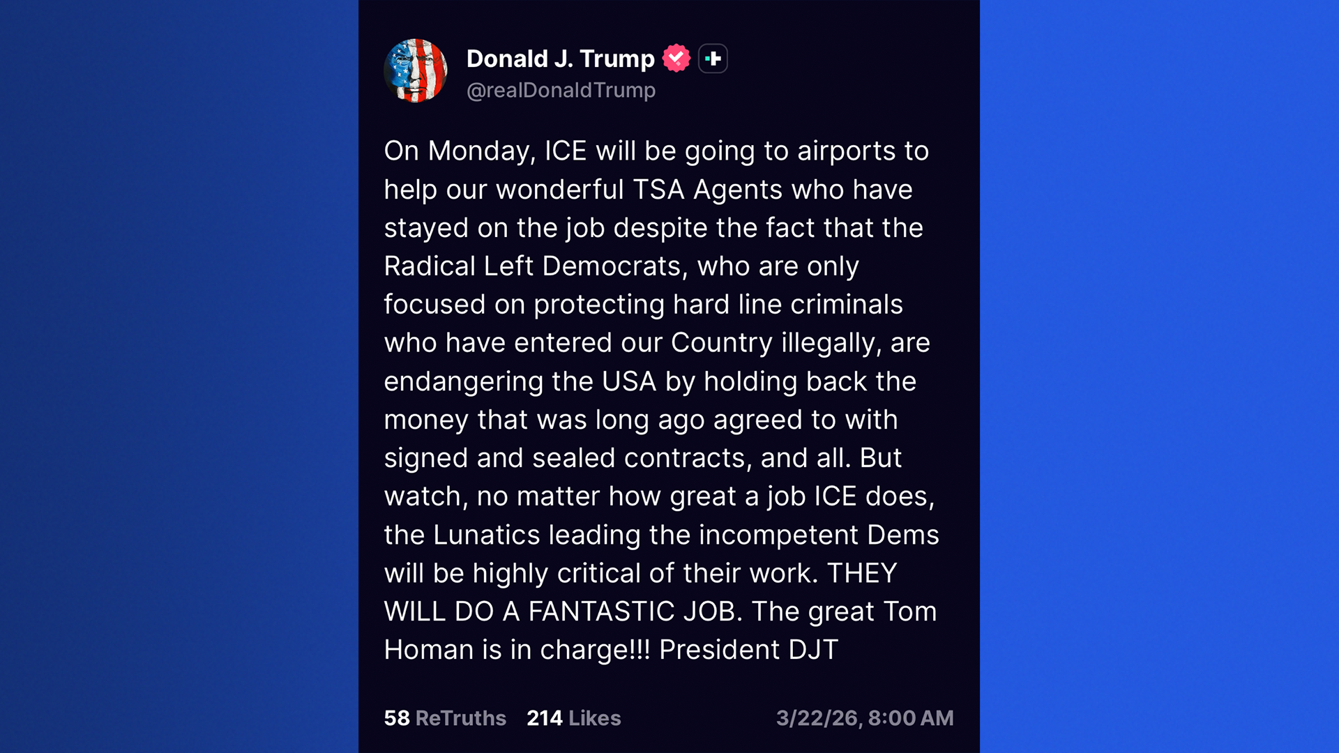 In his post, President Trump blamed Democrats for the conditions TSA agents have had to operate under and said Tom Homan, the White House border czar, would be running the operation.