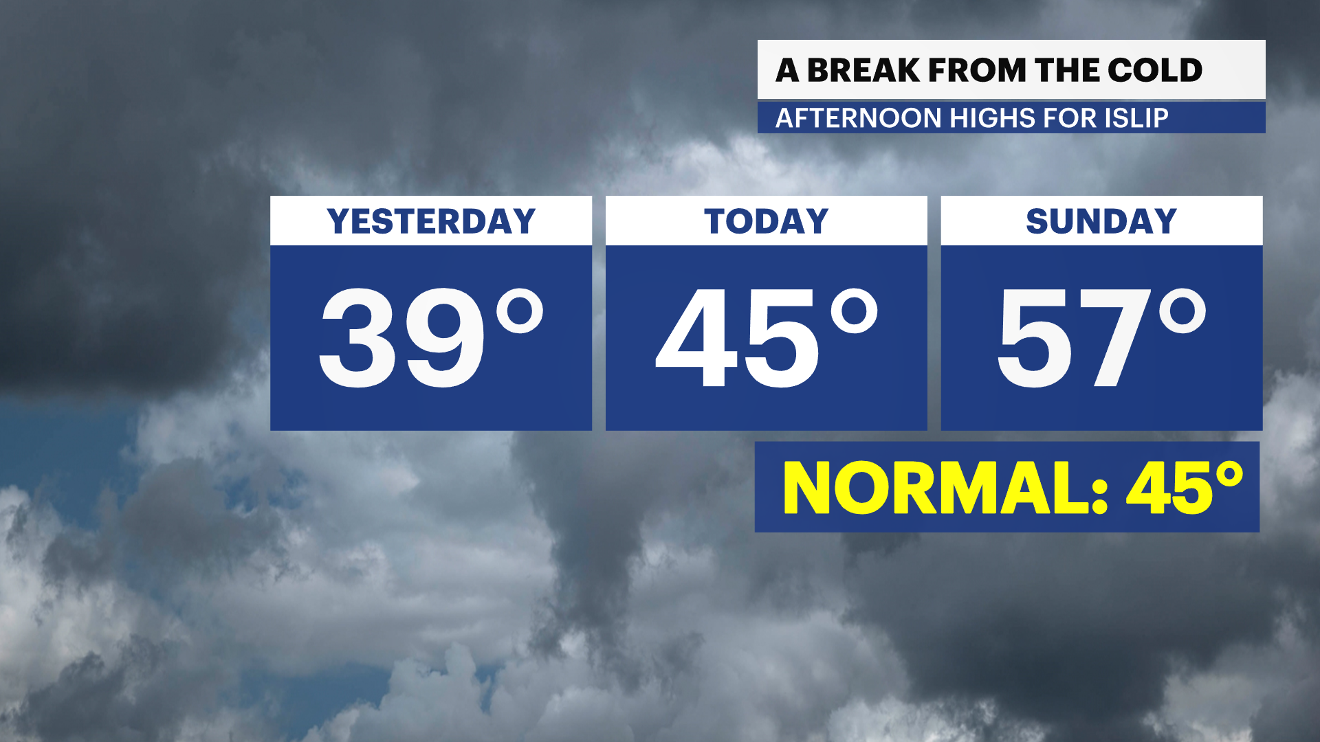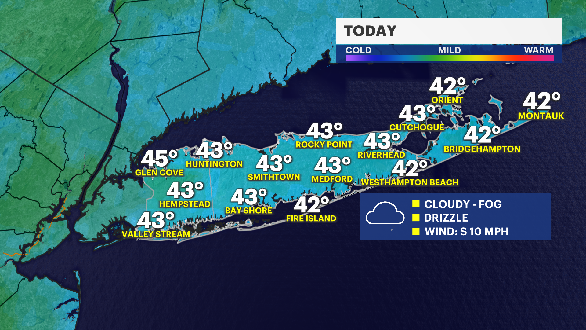 There can be a 20 degree or more difference in high temperatures from the East End to parts of Nassau and western Suffolk. Highs near 50 expected for the south shore, upper 40s out east. The warmest parts of the island will approach 60 degrees.