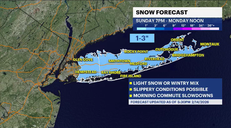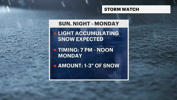 A coastal storm will skate to our south Sunday night into Monday, but it does not miss us completely. On and off snow is expected Sunday after 7 p.m. into Monday morning. At this time, we are forecasting a dusting to 3 inches of snow; the snow could wobble closer (or farther away), so this forecast could change by Sunday morning.