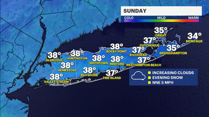 We expect Sunday to be a mostly cloudy day with light wind and highs in the upper 30s. Generally, it's about seasonable for this time of the year.